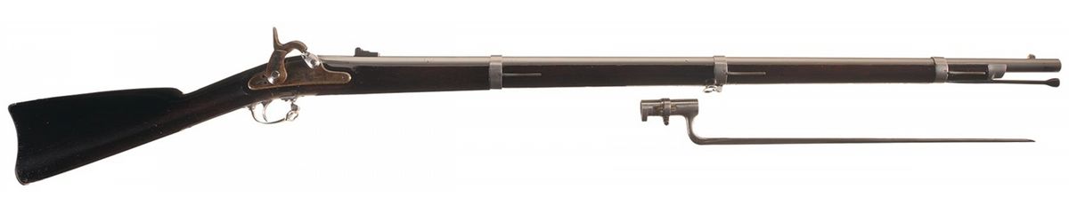 Believed to have been manufactured by A.H. Waters & Co. of Millbury, Massachusetts, this is a very scarce example of a U.S. Civil War era Model 1861 rifle-musket. The lock plate is dated "1864" at the rear and has the correct unusual eagle facing to the rear with downward point wings (in contrast to all other contract rifle-muskets of this type) and "U.S." MILLBURY" is stamped ahead of the hammer. The barrel, like the lock, is dated "1864" with the left side at the breech having "V/P/eagle head" proofs and "PB" inspector initials. The rifle-musket is equipped with a three leaf rear sight marked "1," "3" and "5." The three barrel bands are stamped with the letter "U" on the right side and single letter inspector initials are stamped on most of the components. It has the armory bright finish with casehardened hammer and lock plate. The full length stock has two script letter cartouches on the left flat and the buttplate is stamped "US" on the tang. The socket bayonet is marked "US."