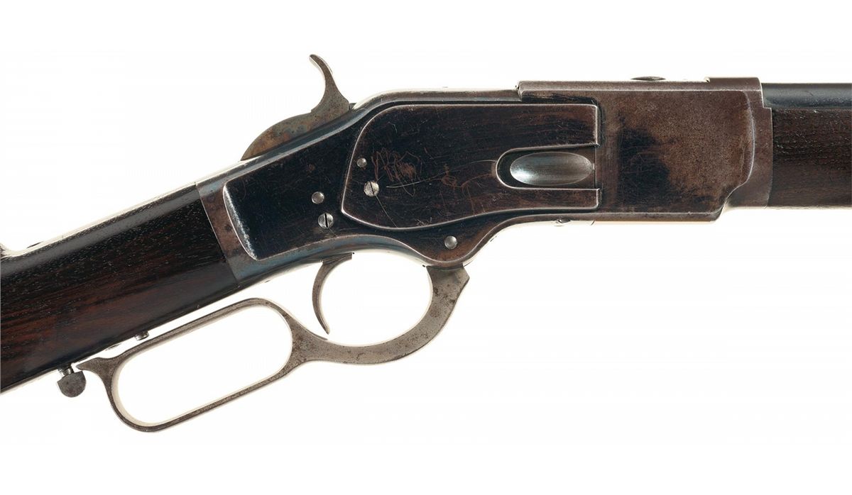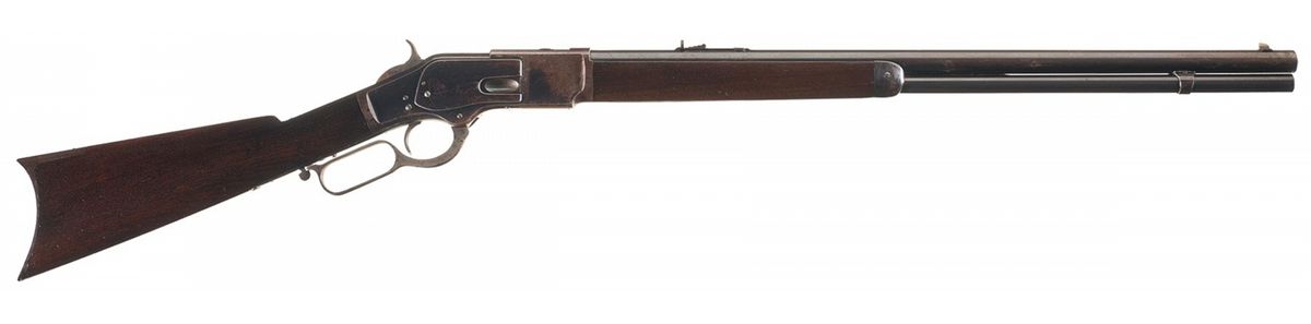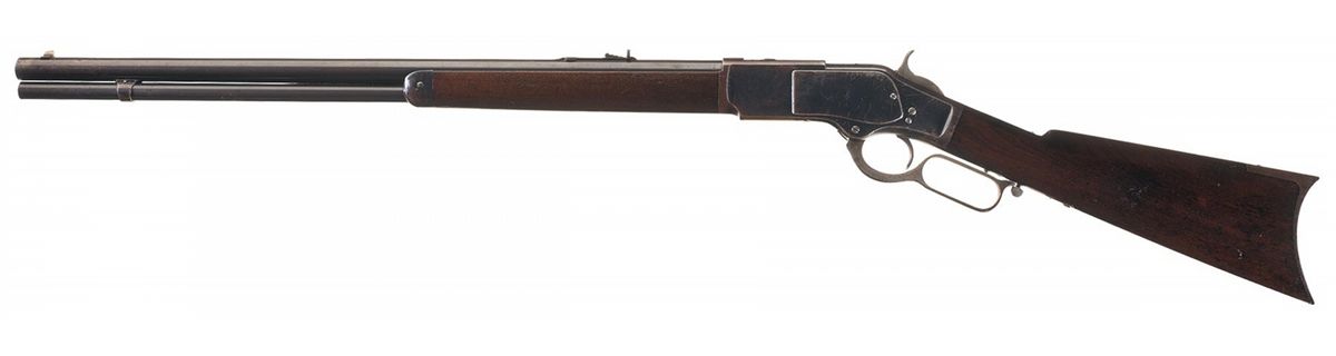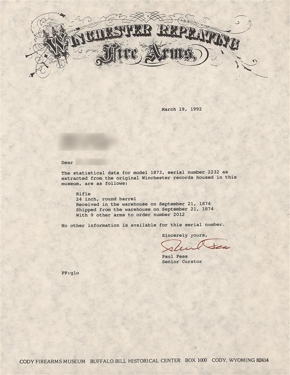 Scarce First Model Winchester 1873 Rifle with Cody Firearms Museum letter. The letter states that the rifle has a 24 inch round barrel and was shipped from the Winchester warehouse on September 21, 1874. The rifle has a blue barrel, magazine, forearm cap and receiver. The hammer, lever and crescent buttplate are casehardened. The stock and forearm are straight grain black walnut with an oil finish. The round barrel has a dovetail mounted sporting front sight with a nickel silver blade and a sporting rear sight with knurled edges. The receiver has the distinctive First Model dust cover with raised oval thumbprint and grooved guides on the sides. The first style lever latch has visible threads. The upper receiver tang is drilled and tapped for a rear sight. The crescent buttplate has a sliding brass trap door and the butt trap contains a four piece jointed steel cleaning rod. The top of the barrel is roll stamped with the legend "WINCHESTER'S-REPEATING-ARMS. NEW HAVEN. CT./KING'S-IMPROVEMENT-PATENTED-MARCH 29. 1866. OCTOBER 16. 1860." ahead of the rear sight. The upper receiver tang is roll stamped "MODEL 1873" in fancy letters. The serial number "2232" is stamped in script numerals on the lower tang between the lever latch and the rear tang screw.