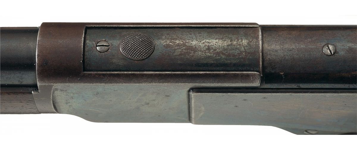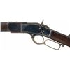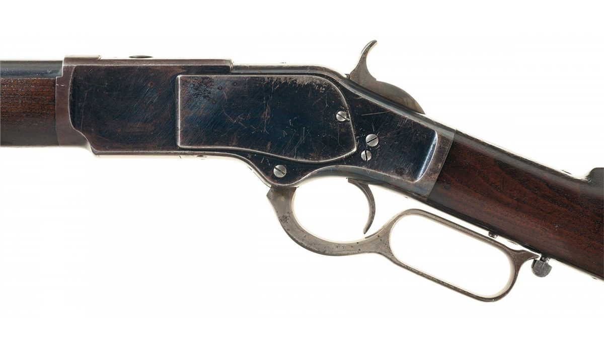 Very fine. The rifle is all original and retains 70% of the original blue finish. Most of the blue finish in present on the barrel, magazine and forearm cap. Wear is limited to some finish loss and light pitting on the right side of the barrel between the muzzle and the magazine band and some handling marks on the top of the barrel and bottom of the magazine. The receiver and side plates have finish loss on contact points and high points along with some scattered light scratches and small spots of surface discoloration. Most of the wear is concentrated on the upper right edge of the receiver. The dust cover has about 50% of the blue finish intact. The hammer, lever and buttplate have about 80% of the casehardened finish intact with faded case colors. The stock and forearm are very good and retain close to 90% of the original finish, wear is limited to a few very minor handling marks. The markings on the barrel and receiver are crisp. First Model Winchester 1873 rifles are scarce in any condition. This is an outstanding example of a First Model 1873 Rifle.