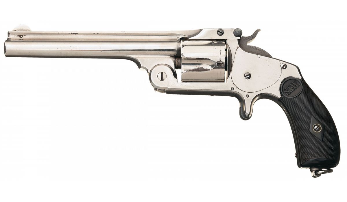 Manufactured from 1877 to 1891. The top of the barrel rib is marked with the two line address/patent dates with the matching serial number on the butt, (partially covered by the lanyard stud), barrel and cylinder. Pinned front sight and notch rear sight on the latch, and lanyard on the butt. Fitted with checkered hard rubber grips with S&W in a circle at the top, with the right panel numbered "3445".