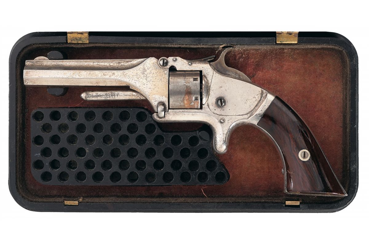 Manufactured from 1860 to 1868, this Model 1, 2nd Issue revolver features a blade front and notch rear sights, 7 round un-fluted cylinder, square flared butt, and scarce all silver plated with casehardened hammer. The top of the barrel is marked "SMITH & WESSON SPRINGFIELD, MASS", the cylinder is marked with the patent dates and the serial number is marked on the butt. Fitted with varnished rosewood grips, with right panel numbered "67129". Assembly number "T" is properly stamped on the rear of the barrel, front cylinder face and right heel under the grip. Complete in an original Smith & Wesson Gutta Percha case with decorative caved lid with the image of a Number 1 revolver and "MANUFACTURED ONLY BY/SMITH & WESSON,/SPRINGFIELD MASSACHUSETTS". Notice the lid was assembled upsidedown, obviously an interesting and unique factory error. The lining in the lid is a floral design purple velvet and there is brown velvet in the bottom and a 56 round cartridge block.