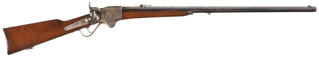 Very few sporting rifles were manufactured by Spencer and educated estimates put total production well under a few thousand. The action first went into production in 1860 and as soon as the Civil War started all of the machinery and manpower was devoted to turning out rifles and carbines for the Civil War (of historical note, sporting rifles manufactured during the Civil War were for presentation, the most famous being Gideon Welles). Post Civil War Sporting rifles such as this one were manufactured circa 1870-1875 using surplus military carbine receivers. The top of the receiver is marked "SPENCER REPEATING/RIFLE CO. BOSTON MASS./PAT'D MARCH 6, 1860." and the serial number appears on the top rear of the receiver next to the hammer. Blade front sight and folding leaf rear sight graduated to 800 yards. Mounted with a smooth walnut forearm with pewter forend and straight grip stock with Spencer steel buttplate.