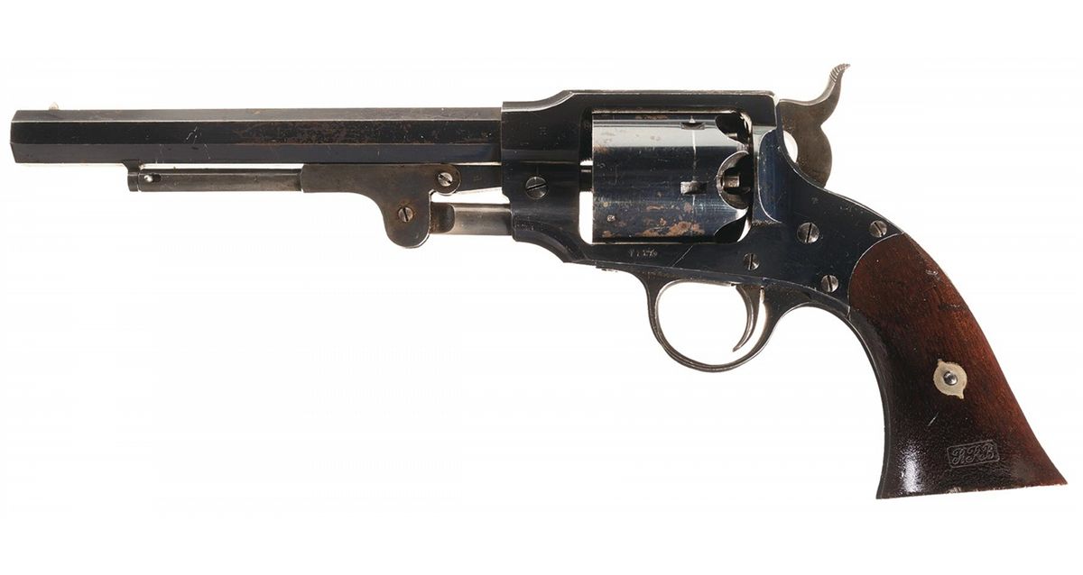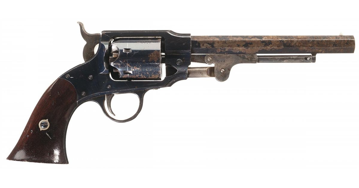 This is an example of one of the approximately 5,800 percussion revolvers manufactured circa 1863-65 by Rogers & Spencer of Willowdale, New York, (which is near Utica). The U.S. Ordnance contract was for 5,000 revolvers, 1,500 to be delivered by the end of April 1865 and the balance by September of 1865. There is no record of issuance of any of the revolvers, due to the Civil War ending. The top strap is marked "ROGERS & SPENCER/UTICA NY". The matching serial number is marked on the bottom barrel flat, left side of the frame, cylinder and on the butt. There are small single letter "B" and "H" inspection marks on most of the parts, including the bottom of each grip panel. The revolver is finished blue with a casehardened hammer, trigger and loading lever assembly. Brass cone front, frame notch rear sights and fitted with smooth walnut grips with a sharp "RPB" cartouche on the lower left panel and "38" stamped on the bottom of the right panel.