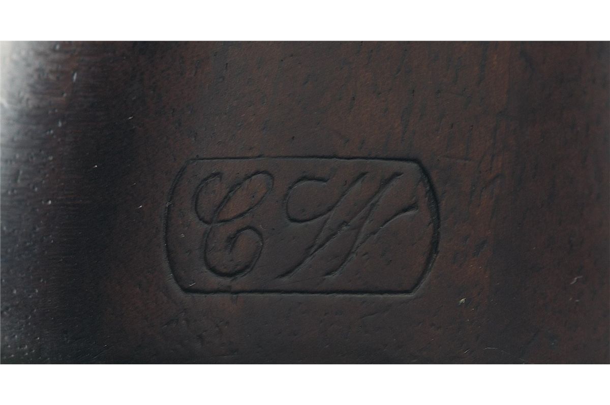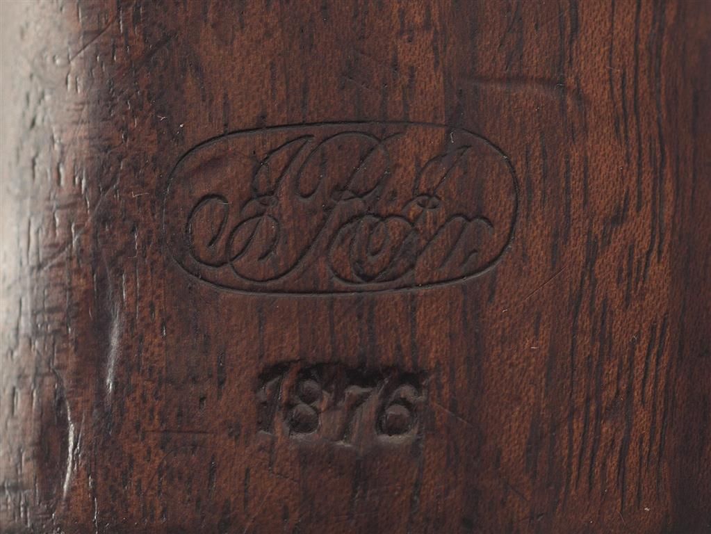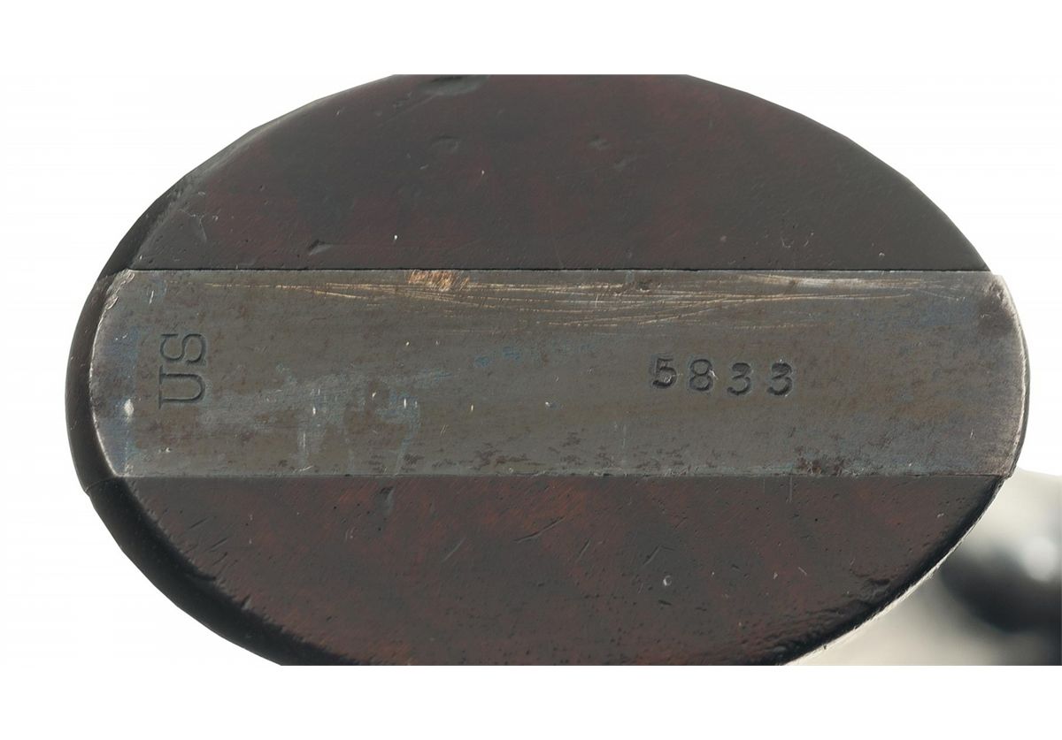 Smith & Wesson manufactured approximately 5,934 of these revolvers for the U.S. military circa 1876-77. The two line address/patent dates is marked on the left side of the ejector housing flanked by elongated Maltese crosses. The right side of the ejector housing is marked "+SCHOFIELD'S PATS JUNE 20th 71 APR 22nd 78+". The butt is marked "U.S." on the heel along with the serial number "6338". The rear cylinder face is stamped with the matching serial and Ordnance sub-inspector's "E" and "P", which are also marked on the bottom flat of the ejector housing. Fitted with smooth walnut grips with a clear oval Ordnance inspector's script initials cartouche over the date "1876" on the left side and "CW" on the right side. The matching serial number is stamped on the inside of the right panel. Many Schofield revolvers were issued to the 4th Cavalry which saw service in the "Geronimo Campaign" and the famous 9th and 10th U.S. Cavalry comprised of the "Buffalo Soldiers" stationed in the American Southwest. People such as the James Brothers, Cole Younger, U.S. Marshall Bill Tilghman and the Chief Scout for Custer, "Lonesome Charley" Reynolds were known to carry a Schofield revolver.