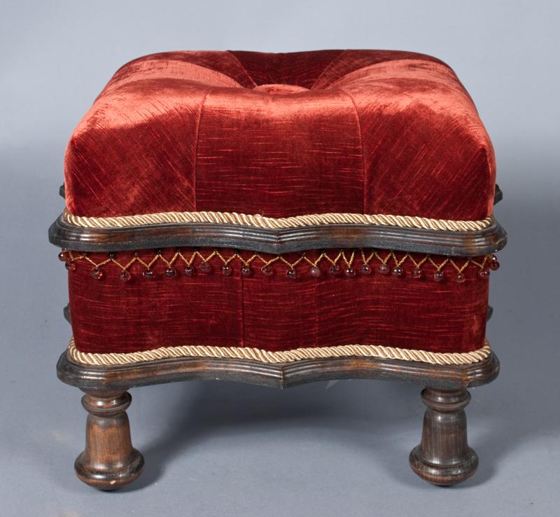 Two sectioned stool on four bell form feet, upholstered in deep red velvet style fabric, with golden cord and red bead decorations. 15" H x 17" L x 14" W; very good condition.