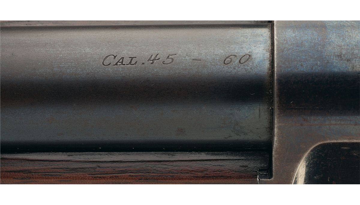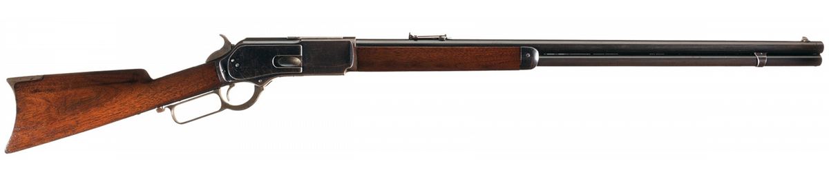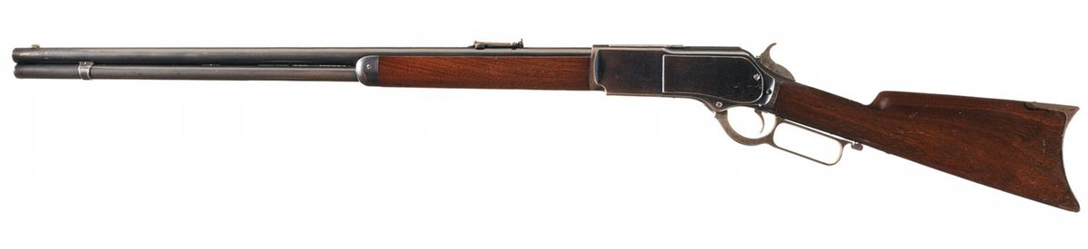 This is an exceptionally nice high condition Winchester Model 1876 Lever Action Rifle that was manufactured in 1882. The top of the barrel is roll-stamped in two lines: "WINCHESTER'S- REPEATING ARMS. NEW HAVEN. CT./KING'S-IMPROVEMENT-PATENTED-MARCH 29.1866. OCTOBER 16.1860.", with the breech end roll marked: "CAL. 45-60" ahead of the receiver. The upper receiver tang has the final, third style "MODEL 1876" marking with foliate letters. The bottom of the brass cartridge elevator is inscribed "45-60". The serial number "26551" is stamped on the lower receiver tang behind the loading lever latch. The receiver has the integral dust cover rail and dust cover with serrated edges. The barrel is fitted with the original factory half nickel/silver blade front sight, with the "1876" marked adjustable folding leaf rear sight, marked: "2-10" (200-1000 yards). The stock is fitted with the original steel buttplate with a sliding brass trap door. These rifles have a rust blued finish on the barrel, magazine tube, receiver and side plates with a casehardened hammer, loading lever, forearm cap and crescent steel buttplate. The dust cover and loading gate are niter blue. The walnut stock and forearm are varnished.