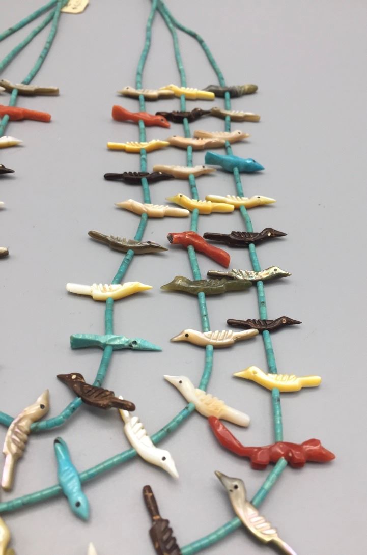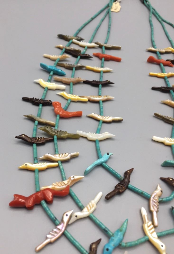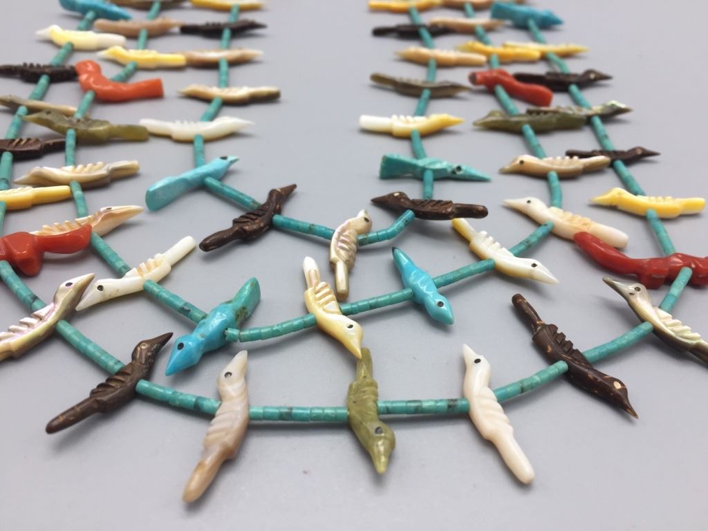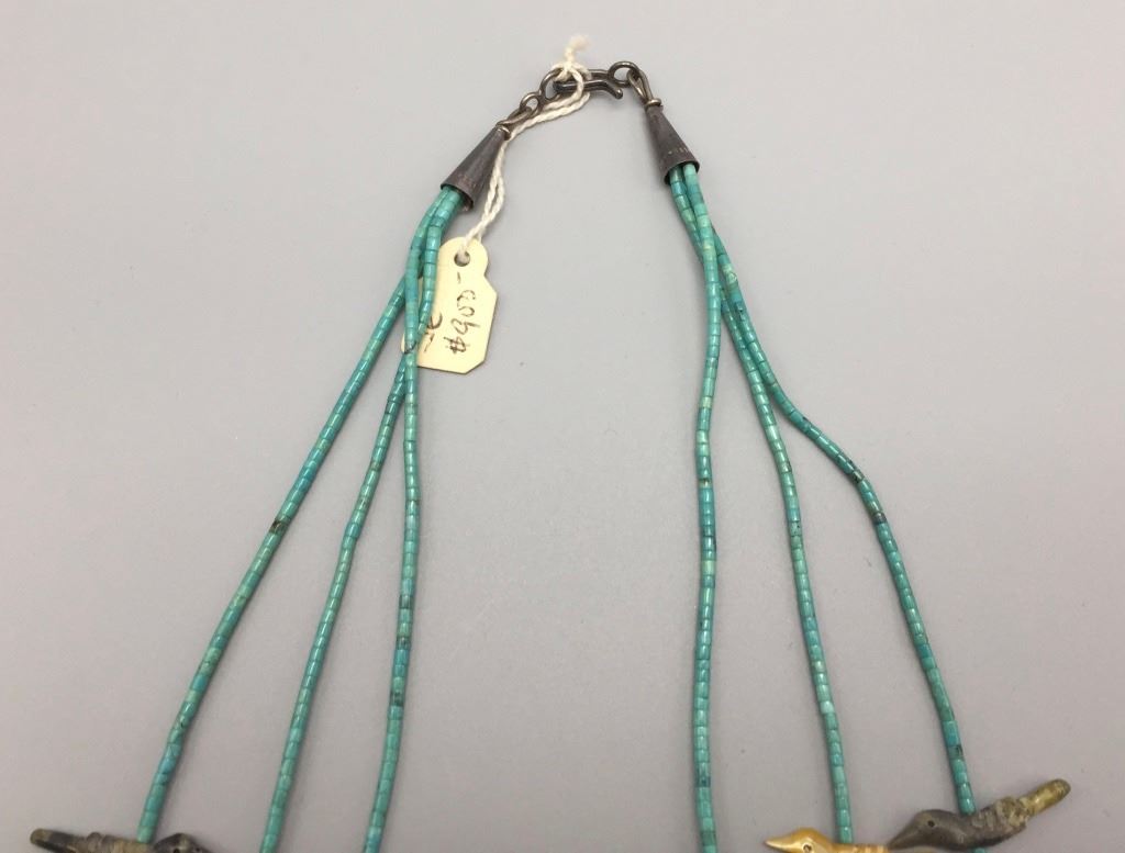 Maker: The tag says, Edna Leki (1924 - 2003), Zuni. However, this has been strongly attributed to Lavina Tsikewa (1938 -?) the daughter of Mary and David Tsikewa (sister of Edna Leki). Approx. Age: Circa 1970s. Size: Fits 21” on the shortest strand and 26” on the longest. Condition: Good. NOS. Additional Info: Wether this is made by Lavina Tsikewa or her aunt, Edna Leki, either way, they are both well-known fetish carvers from the same family. Experts agree, this looks more like Lavina's work (a few coral fetishes may have been thrown in from elsewhere). It is very nicely carved with turquoise heishi with sterling findings. Please look closely at the pictures - they are an important part of our description. Shipping: There will be a $5 handling / packaging fee for shipping this lot. The actual cost of postage will be added on top of that.