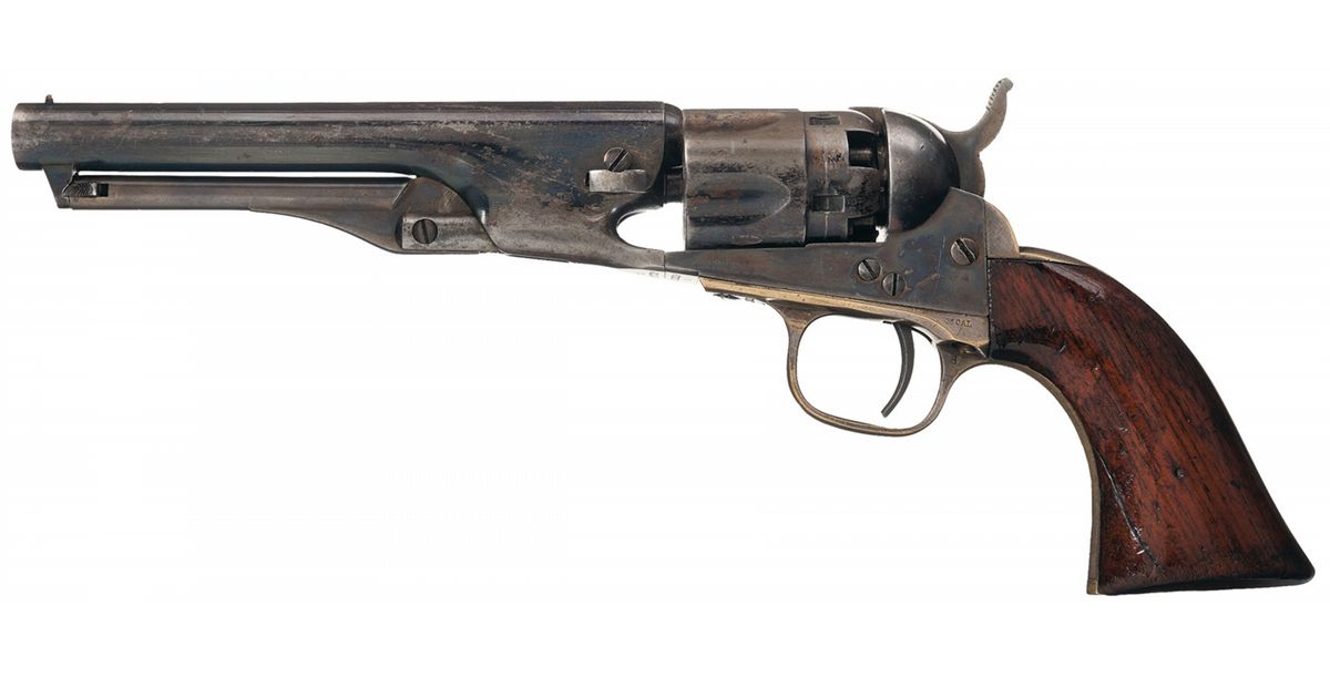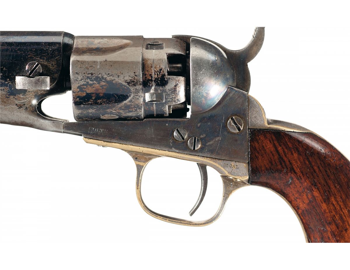 Manufactured in 1863. The top of the barrel is marked with one line block letter New York address and has a pin front sight. The cylinder is stamped "PAT. SEPT. 10th 1850" inside one of the flutes, the frame is stamped "COLTS/PATENT" on the left side, the trigger guard is marked "36 CAL" and "8" on the left side. The revolver has all matching numbers, with the letter "L" stamped next to the serial numbers on the barrel, frame, trigger guard and back strap. The "L" marking is seen on steel strapped British proofed London revolvers. Blue finish with casehardened loading lever and frame and silver plated brass grip straps. Fitted with a smooth one piece varnished walnut grip. The '62 Police is regarded by many as one of the most streamlined production arms to leave the Colt factory during the Percussion Era.