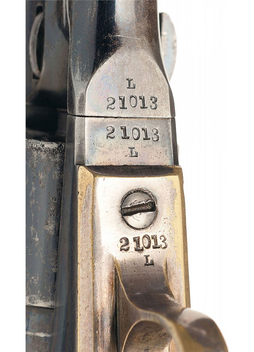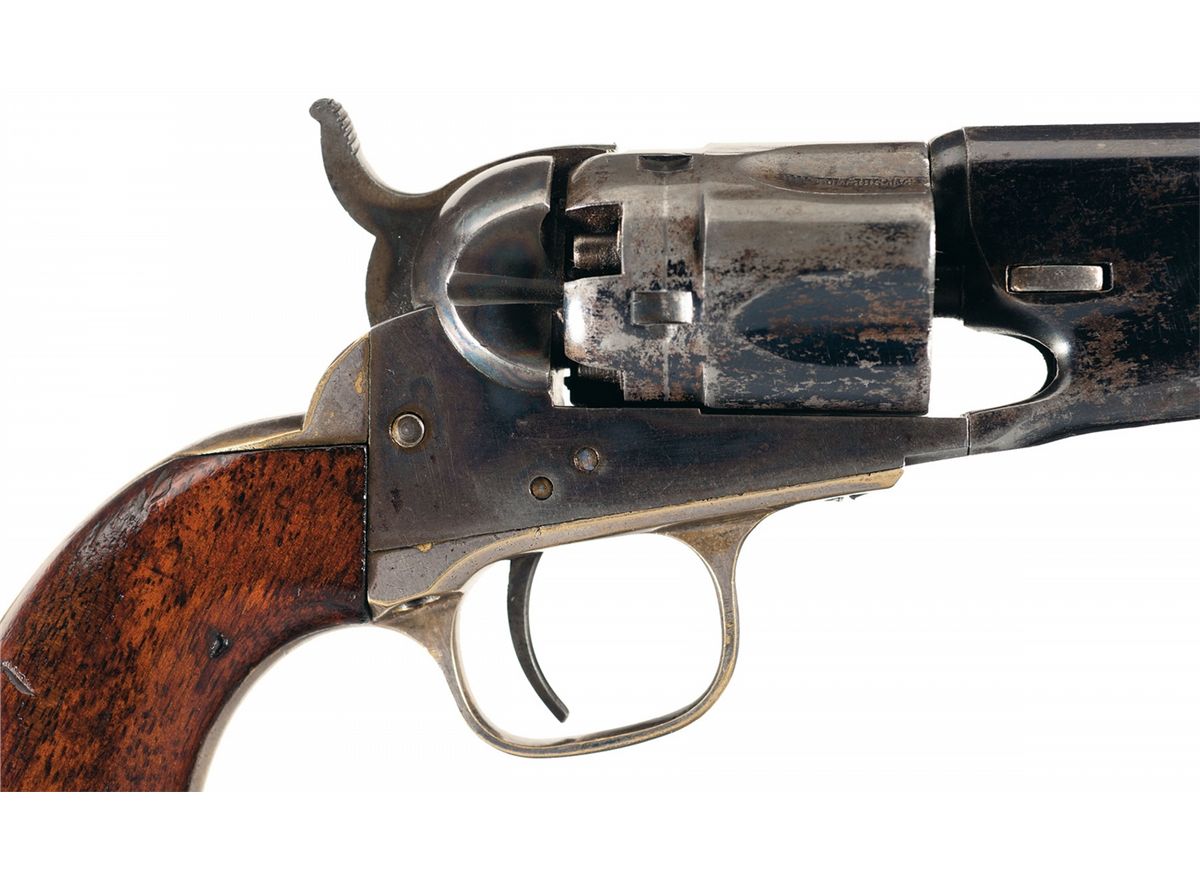 Condition: Very fine. The revolver retains 80% bright original blue finish. The barrel has a few areas of mottled brown with patches of satin gray on the underside of the lug and at the muzzle. The cylinder has a mix of original blue with mottled brown and a smooth gray patina. The frame retains 75% original casehardening colors. The trigger guard has almost all of the original silver finish and the backstrap has silver at the top with the exposed brass having a fine aged patina. The grips are very good with some dings and scratches with wear around the butt. Mechanically excellent.