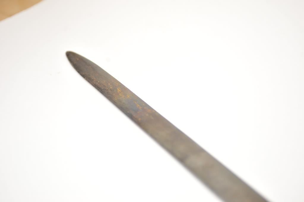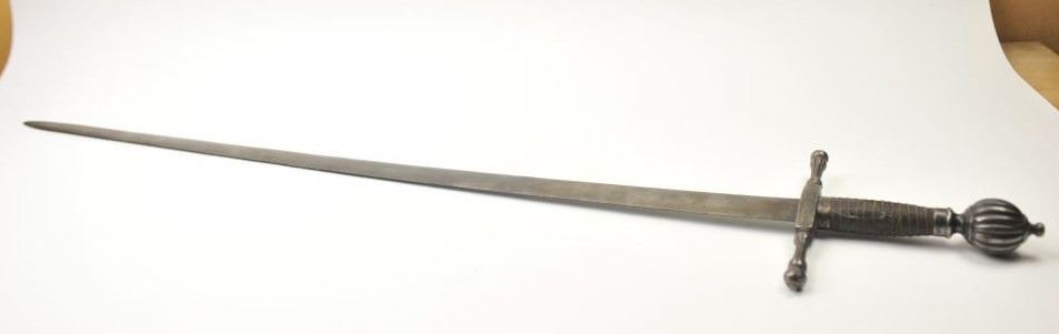Very Good Victorian era 1 ½ hand sword with well executed etched guard and bulbous egg shaped pommel (looks period) and a single thin wire wrapped leather over wood grip. The sword is 45” in overall length with a 38” blade measuring 1 5/8” across the ricasso. The blade shows minor pitting and erosion with over 150 years of natural aging. The blade is properly tempered and an attractive decorative element of armor for display,possibly Schmidt or Heinrich workshops. Est.: $600-$1,200.