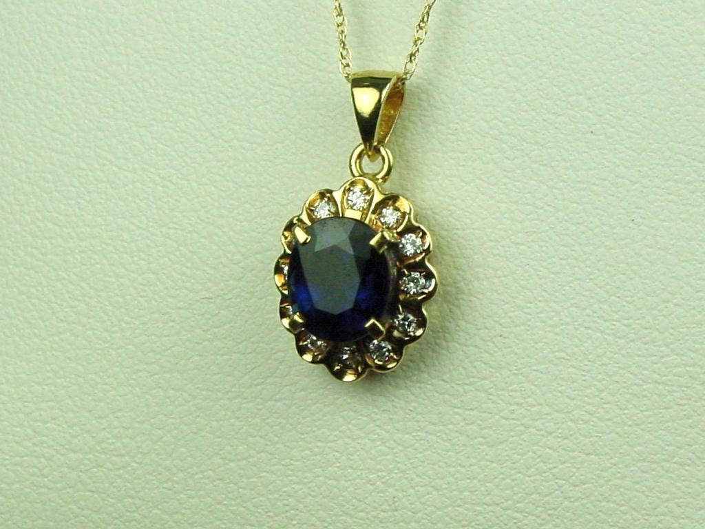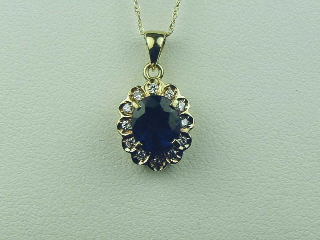 Very High Quality Ladies 18K YG Custom Pendant Set with a center fine blue sapphire weighing approx 1.50 carats and pave set with 12 side diamonds weighing approx 0.20 carats of F-G colors and VS clarity. Retail $1,950.00. A fine item.Set with a center fine blue sapphire weighing approx 1.50 carats and pave set with 12 side diamonds weighing approx 0.20 carats of F-G colors and VS clarity. Retail $1,950.00. A fine item.