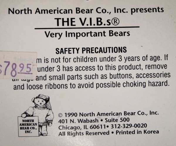 Very Important Bears Bearlie Chaplin (Charlie Chaplin) Stuffed Bear, comes with original tag, measures 22''L x 14.5''W, Introduced in Spring of 1991 and Retired in the Spring of 1995, FYI: ''Odl Bauer, who sewed the first bear, joined Paul and Barbara Isenberg and together they worked on developing the VIB's (Very Important Bears). Using her English literature background, Barbara experimented with a variety of names and puns for these colorful 20'' velour bears. The first was Douglas Bearbanks, based on the legendary silent film star. He was followed by Scarlett O'Beara, Chef Bearnaise and Amelia Bearheart. The VIB's are all retired and often increase dramatically in value on the secondary market.''
