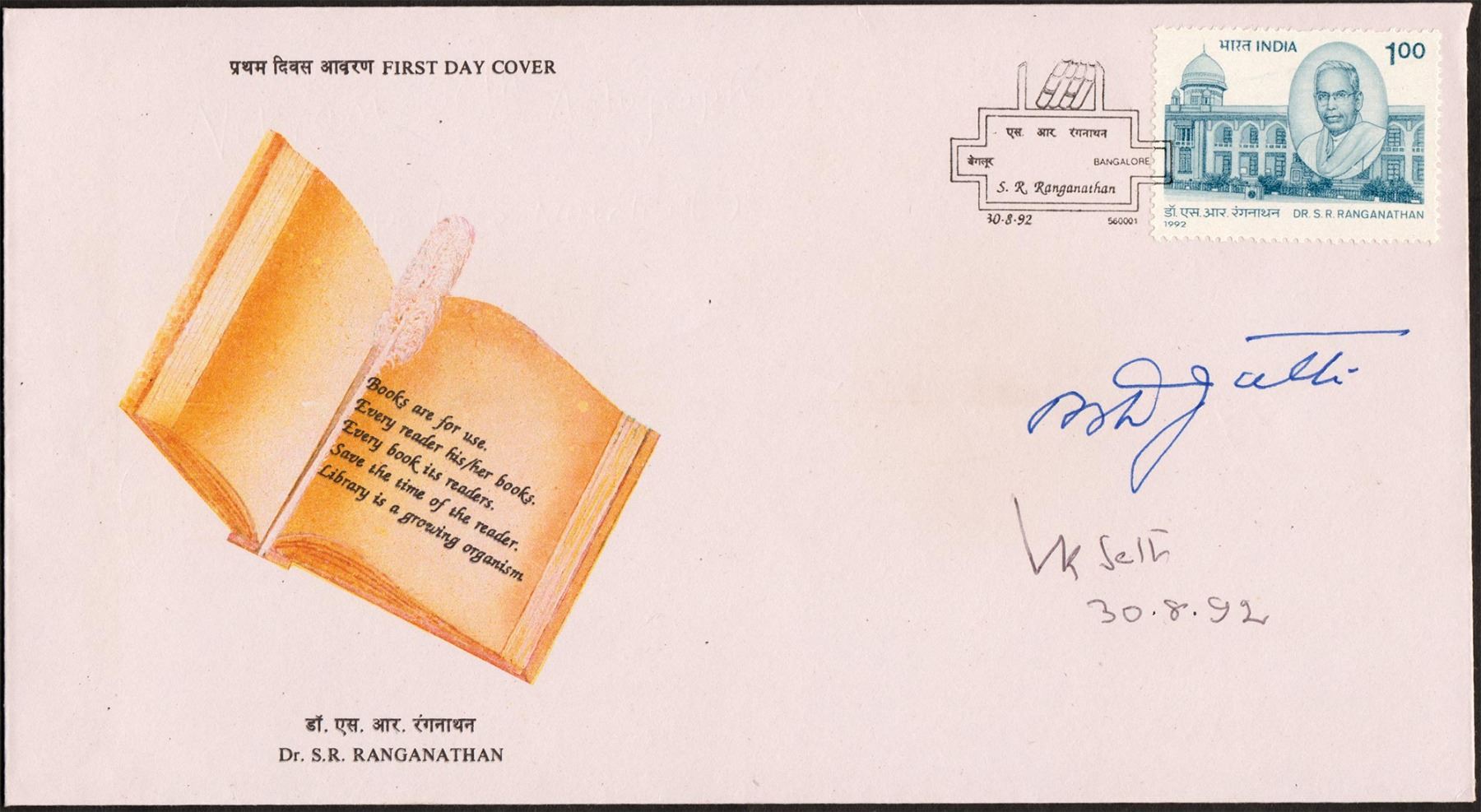 Autographed First Day Cover, 1992, autographed by “Vikram Seth” the famous Indian poet and novelist on 30.8.92, stamp of 1 Rupee commemorating the birth centenary of Dr. S. R. Ranganathan, cancelled with a distinguished seal illustrating the distinctive scholarly characteristics of Dr. S. R. Ranganathan – books, with text in Devanagari and English “एस आर रंगनाथन | बेंगलूर Bangalore | S. R. Ranganathan | 30-8-92 560001”, his name also printed on the front in Devanagari and English, the picture of a book describes a slogan, very good condition, Rare.