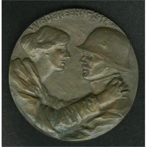 <B>Very Large 1918 German World War I Medal.</B></I> 102 mm, 297.8 gm. The obverse depicts a loving wife welcoming home a soldier, "Wiedersehen-1918." The reverse of the medal depicts a united family staring at a Christmas tree with the caption "Friede Auf Erden/Peace on Earth."<BR><BR><b>Shipping:</b> Coins & Currency (<a target="_blank" href="http://www.heritageauctions.com/common/shipping.php">view shipping information</a>)