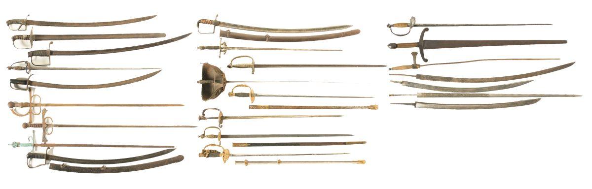 24 blades and swords, a mix of military, civilian and training weapons. Items are in poor to fair condition overall, with several missing hilts and other components.