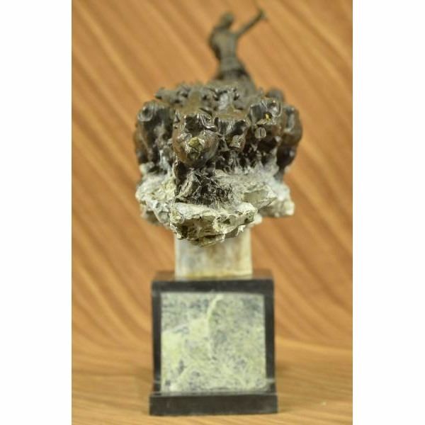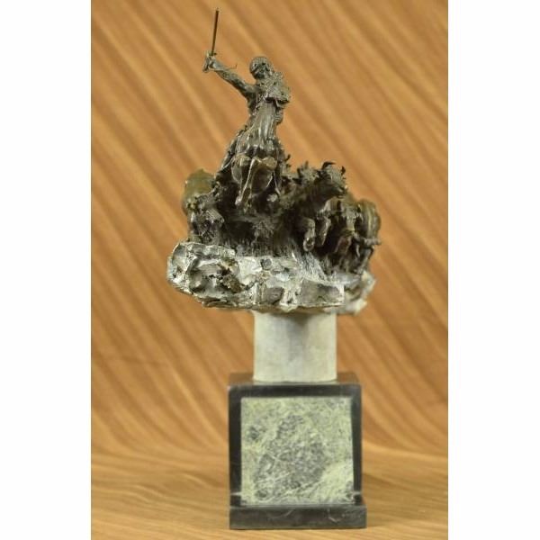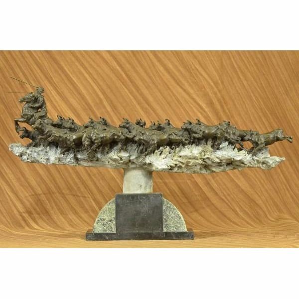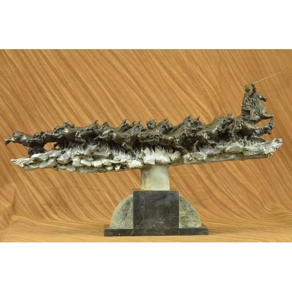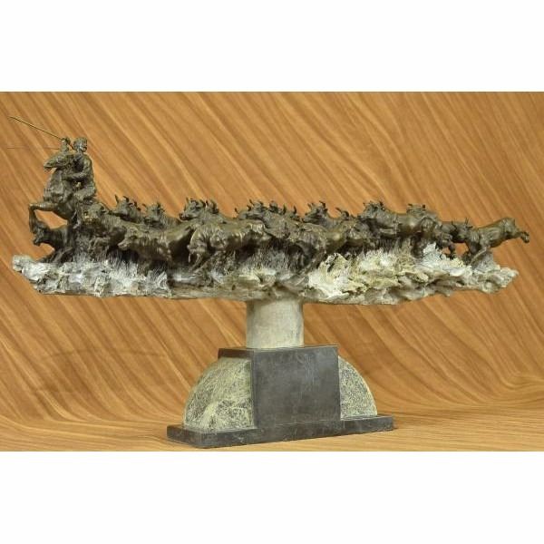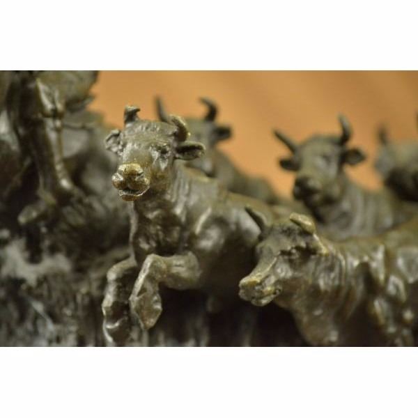 inspired by Charles M Russell's bronze "Wild Cattle for cowboy", Russell modeled the large bulls on "actual animals thinned from the herd at the annual Fall Round-up at the National cattle Range, Moiese, Montana. The animals were all carefully measured with the most generous help of Range Superintendent C. J. Henry and range foreman Victor May. The bronze sculpture was captured using the ancient method of lost-wax casting and finished with a brown patina stain for preservation. She is mounted upon a black marble base with the artistRussell signature. Condition :This sculpture is in a perfect condition. Bronze Dimensions with Marble Base:Height 13" x Width 25" Marble Dimensions: 9" x 4" Height without base: 10" Weight : 34 LBS Inventory 15XN252614451