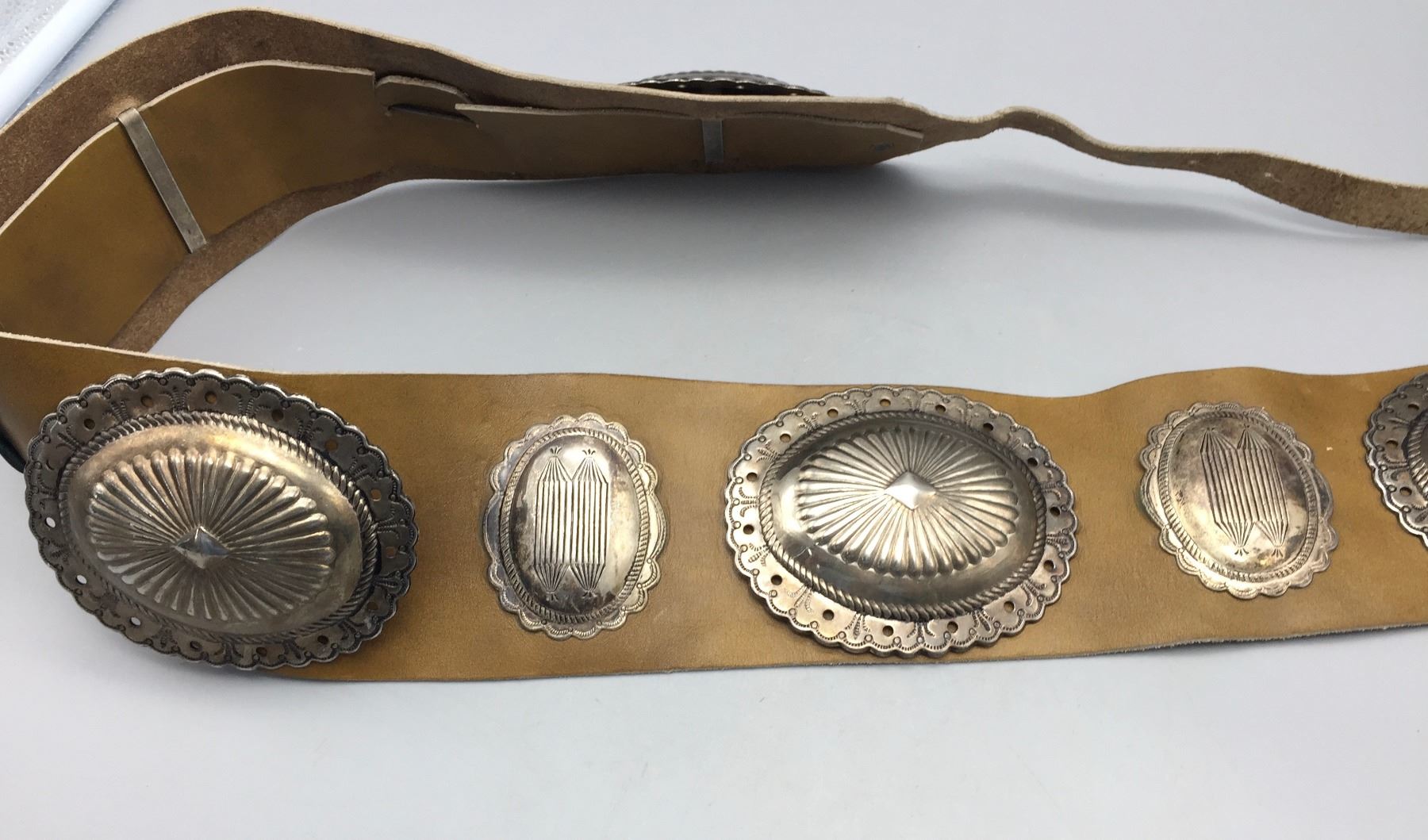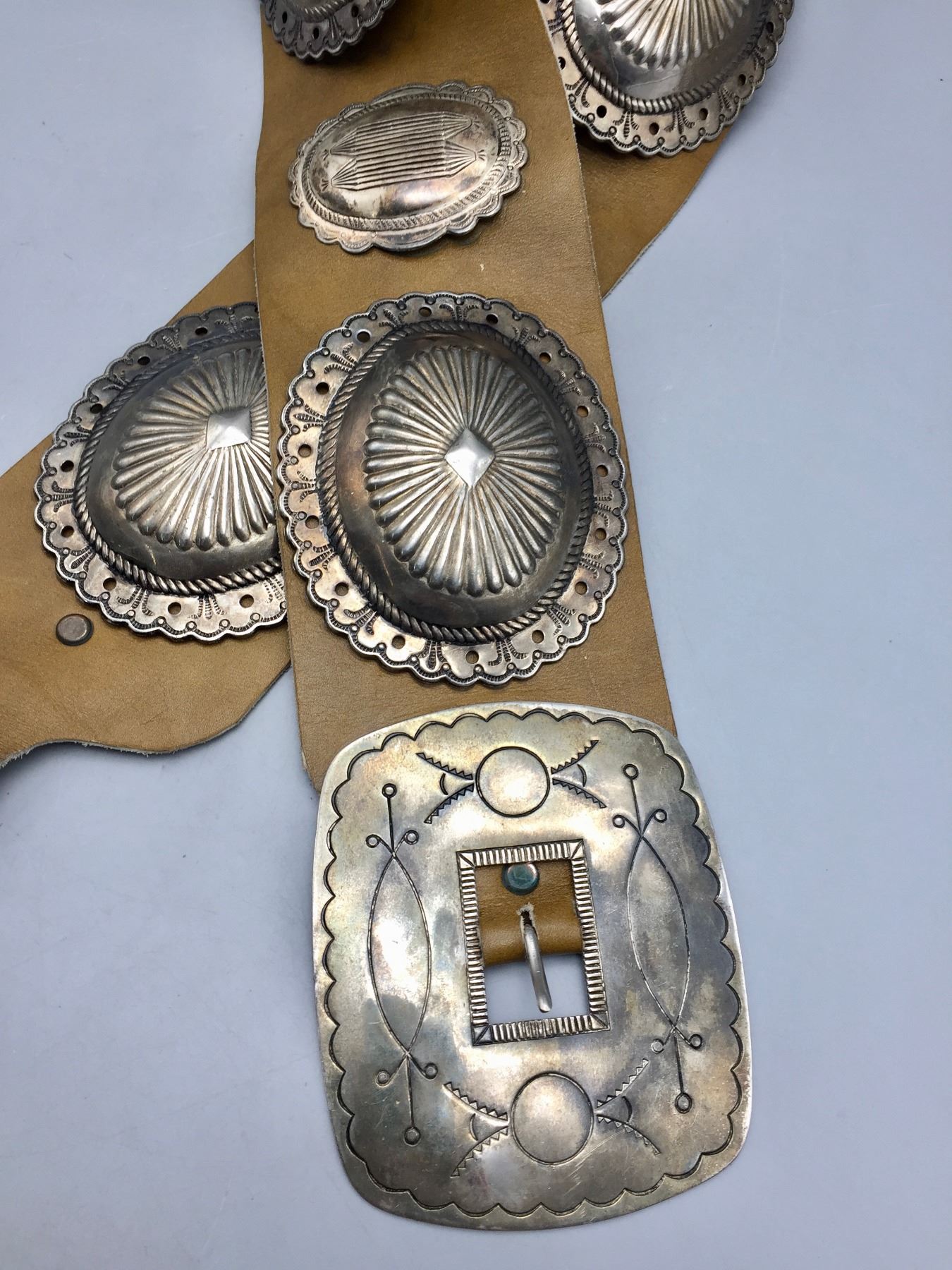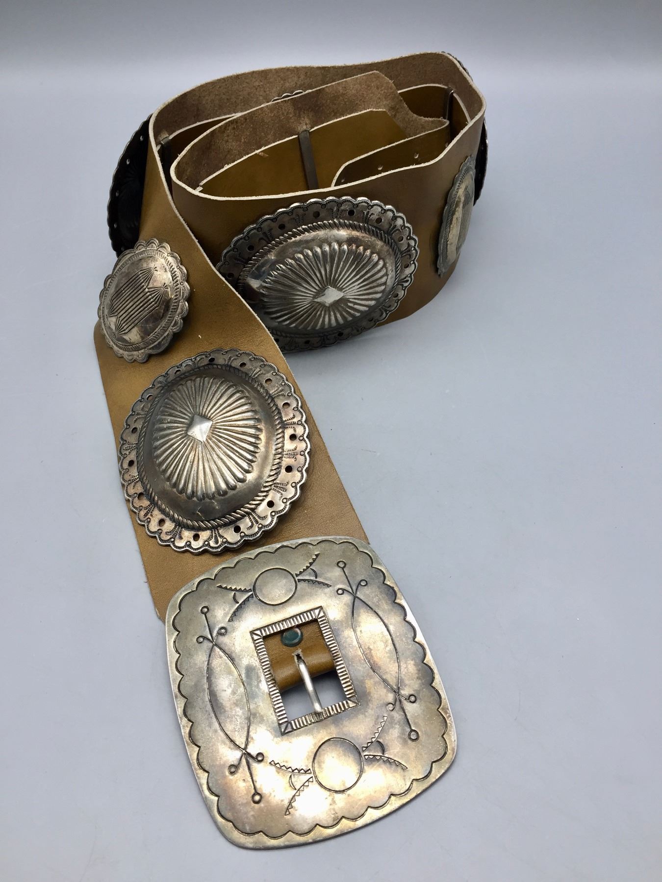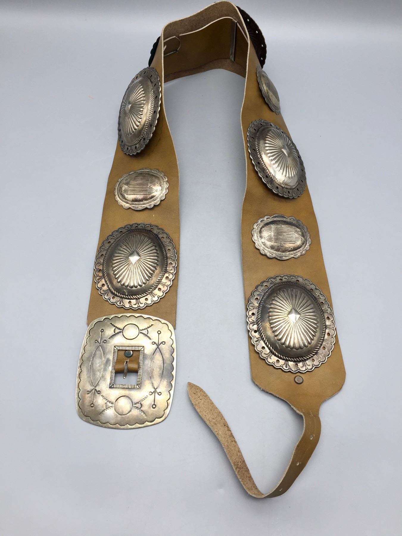Description: For sale in this lot is a very large concho belt on a thick brown leather band with stamped silver conchos which appear to be plated sterling silver, not solid sterling silver. Maker: Unknown.