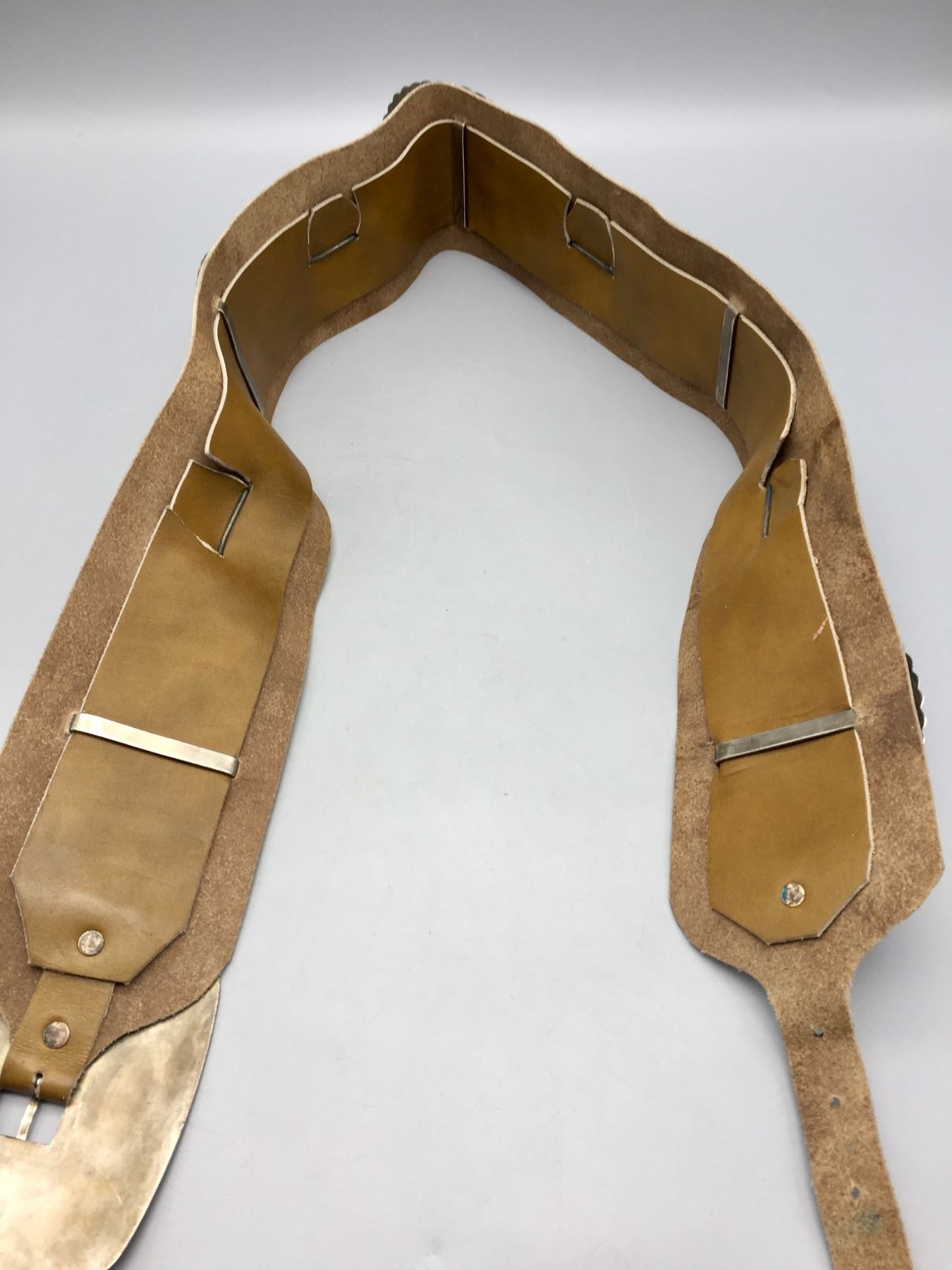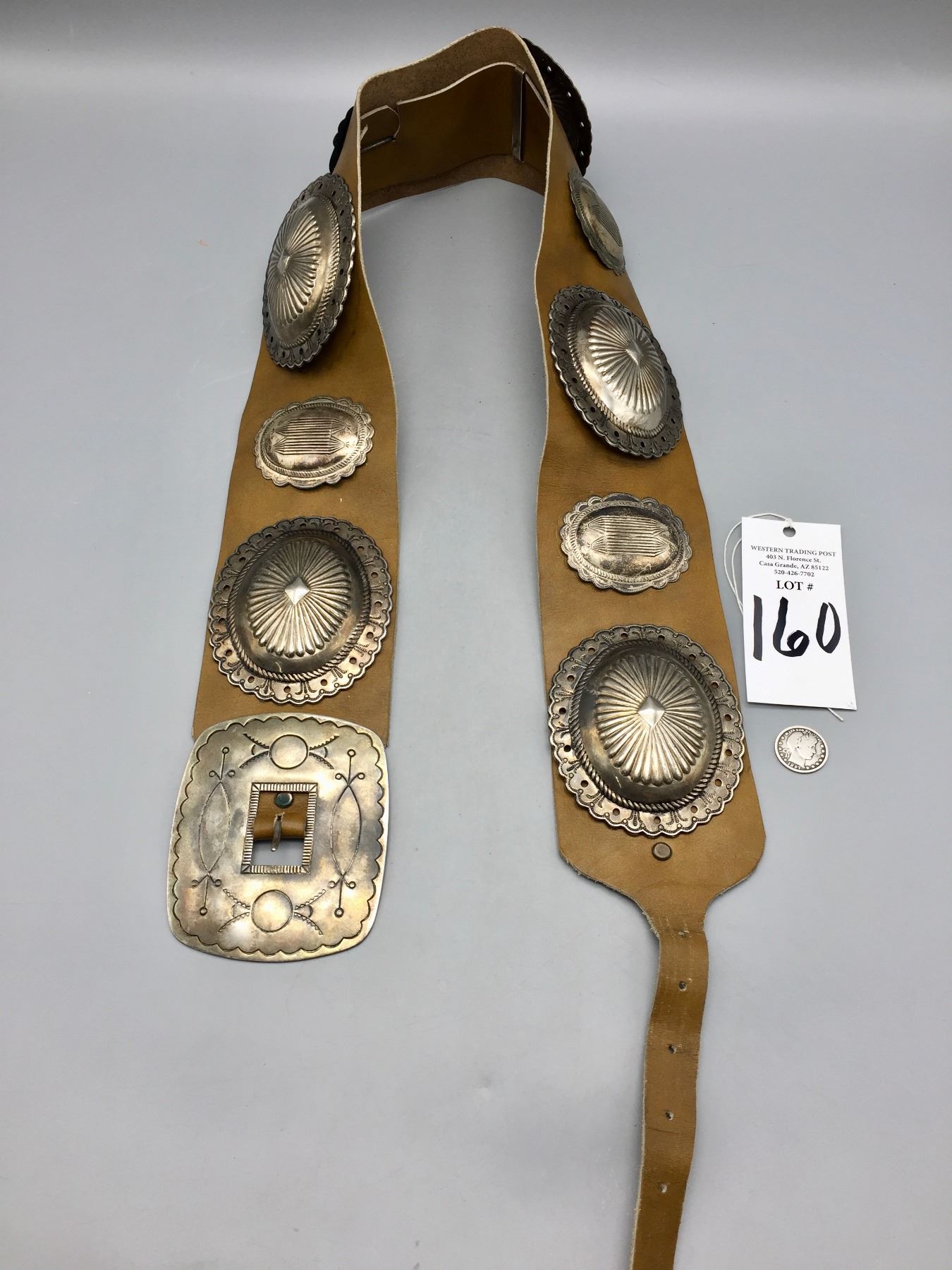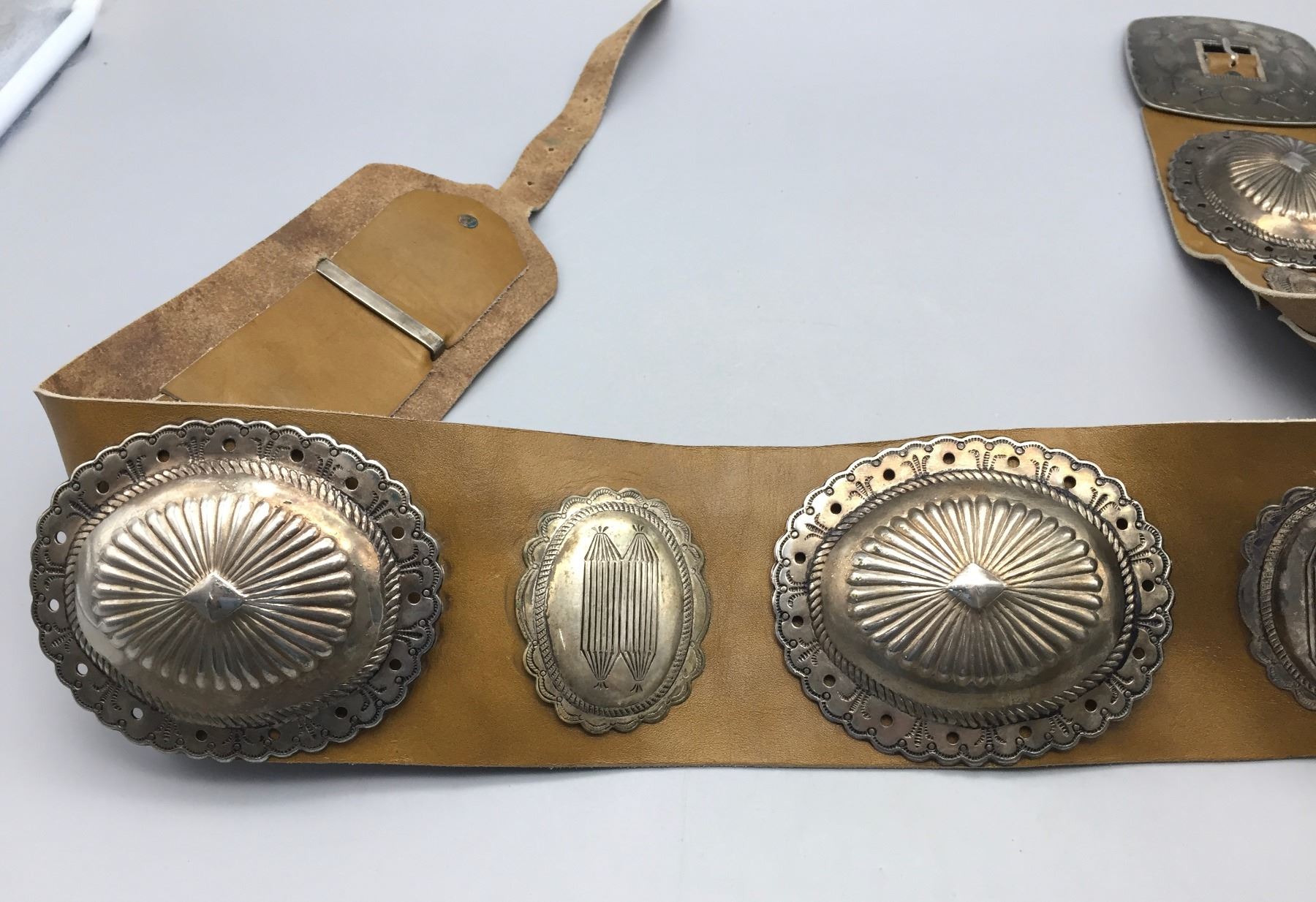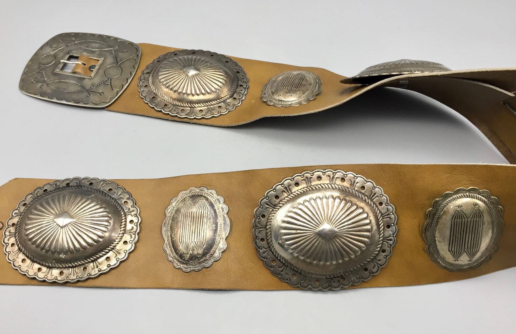 Description: For sale in this lot is a very large concho belt on a thick brown leather band with stamped silver conchos which appear to be plated sterling silver, not solid sterling silver. Maker: Unknown.