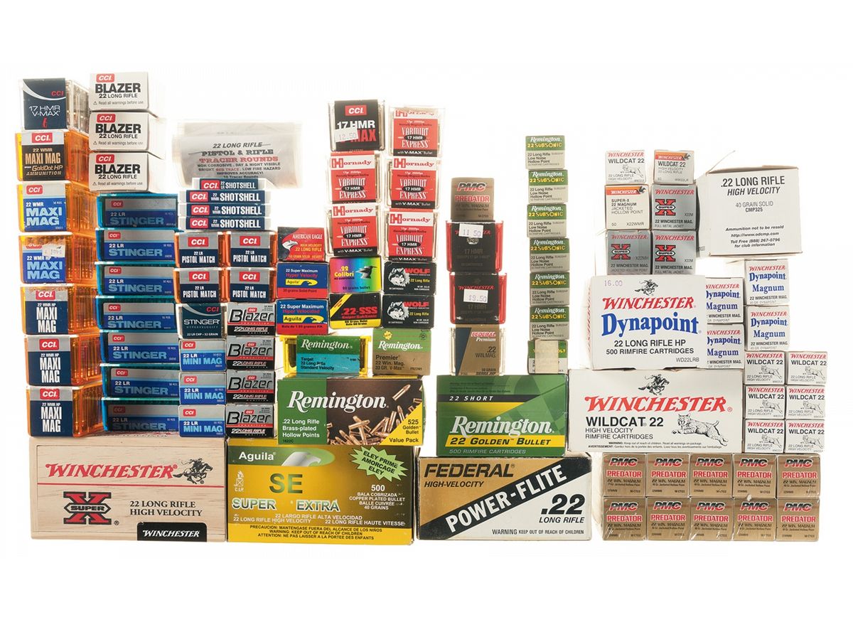 Includes 123 boxes and 5 packages of ammunition, as follows; 5 packages of 22 LR tracer rounds, one 22 Colibri, One 22 Short Brick, twenty-seven 22 Win Magnum, three 22 WMR Shot, one 22 LR shot, six 22 LR bricks, forty-four 22 LR, one 17 Mach 2, ten 243 Winchester, two 7mm Remington Magnum, seven 30-06, one 30-06 tracer, five 45-70 Government, five 28 Gauge, and nine 17 HMR. Assorted makers, weights and velocities. Some partial boxes.