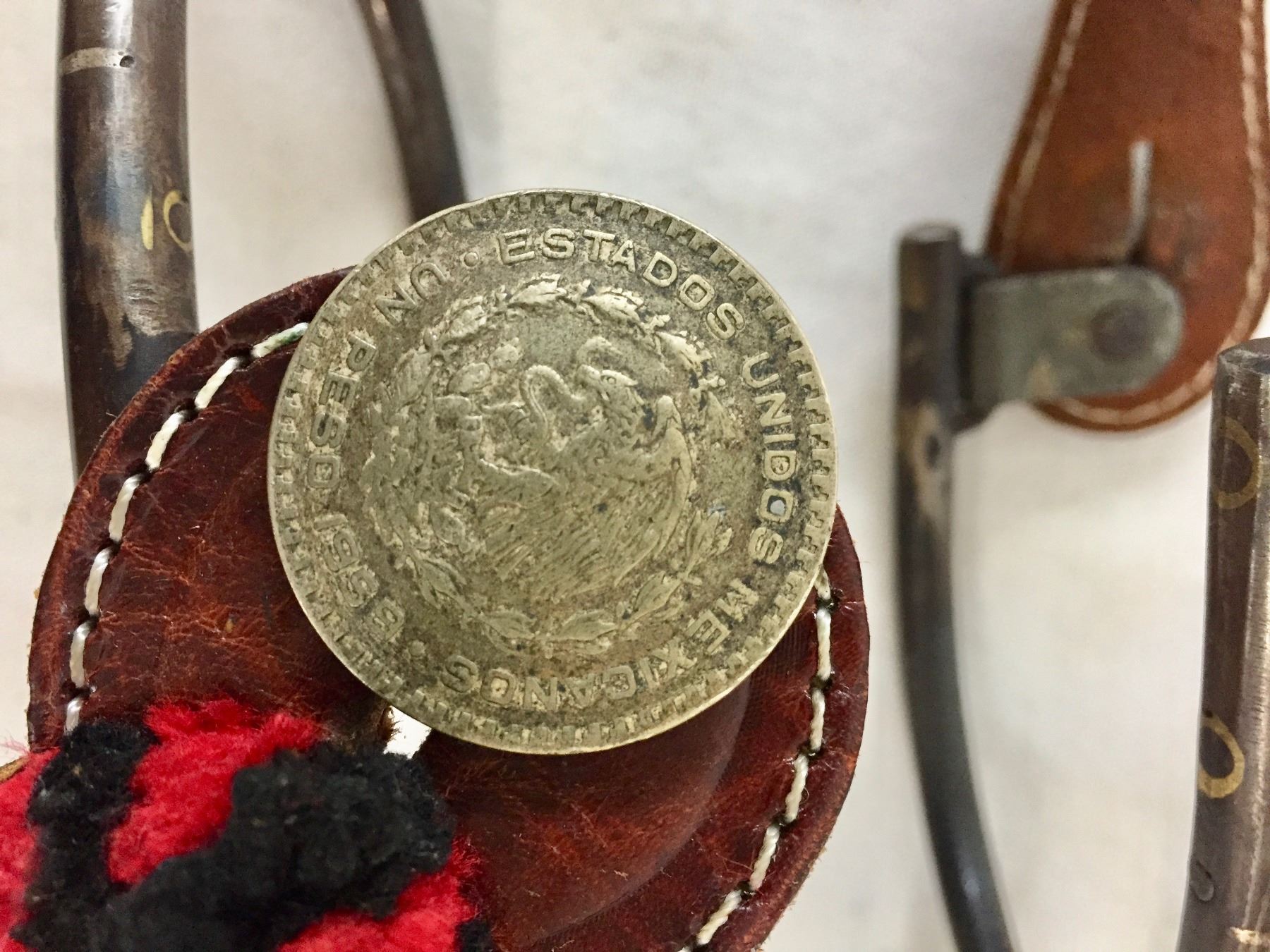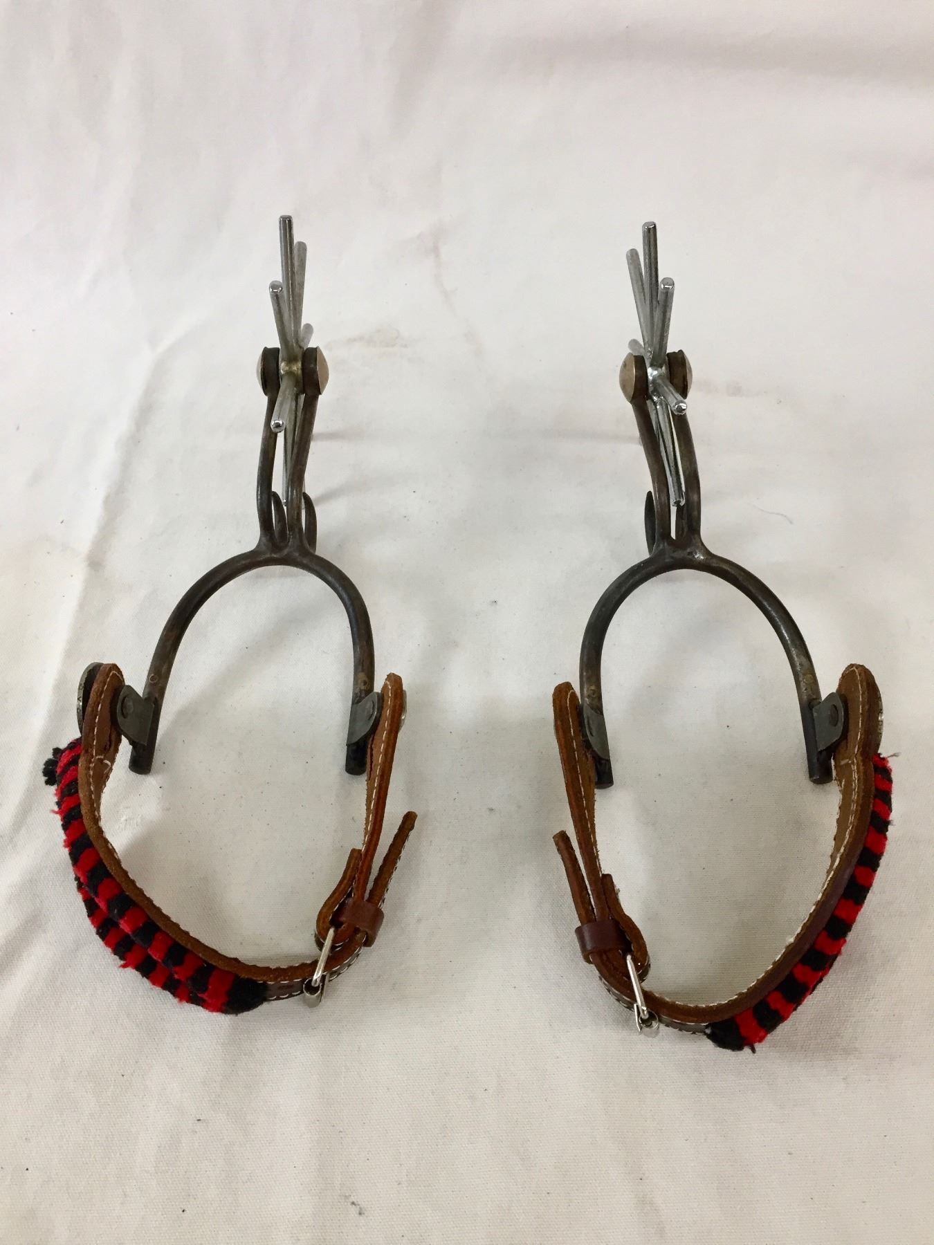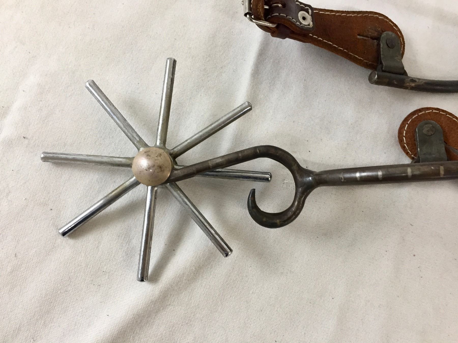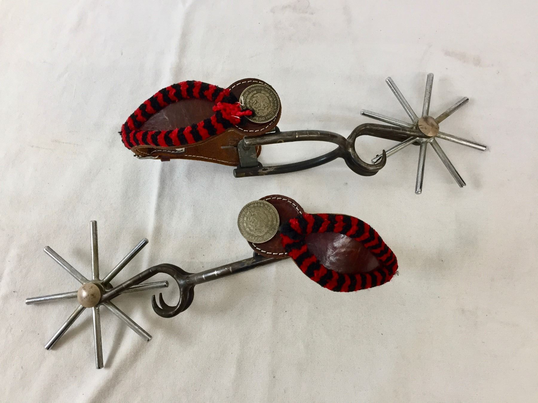 Description: This lot features heavy and large, iron constructed spurs featuring huge, eight point rowels. The swing buttons on the spurs are made of old Mexican Pesos. Maker: Unknown. Approx. Age: Vintage. Size: Heel 3-1/4”wide opening and the spurs are a whopping 11” long overall (including rowels). Condition: Good for its age, normal wear expected. Please look closely at the pictures - they are an important part of our description. Shipping: There will be a $7 handling / packaging fee for shipping this lot. The actual cost of postage will be added on top of that.