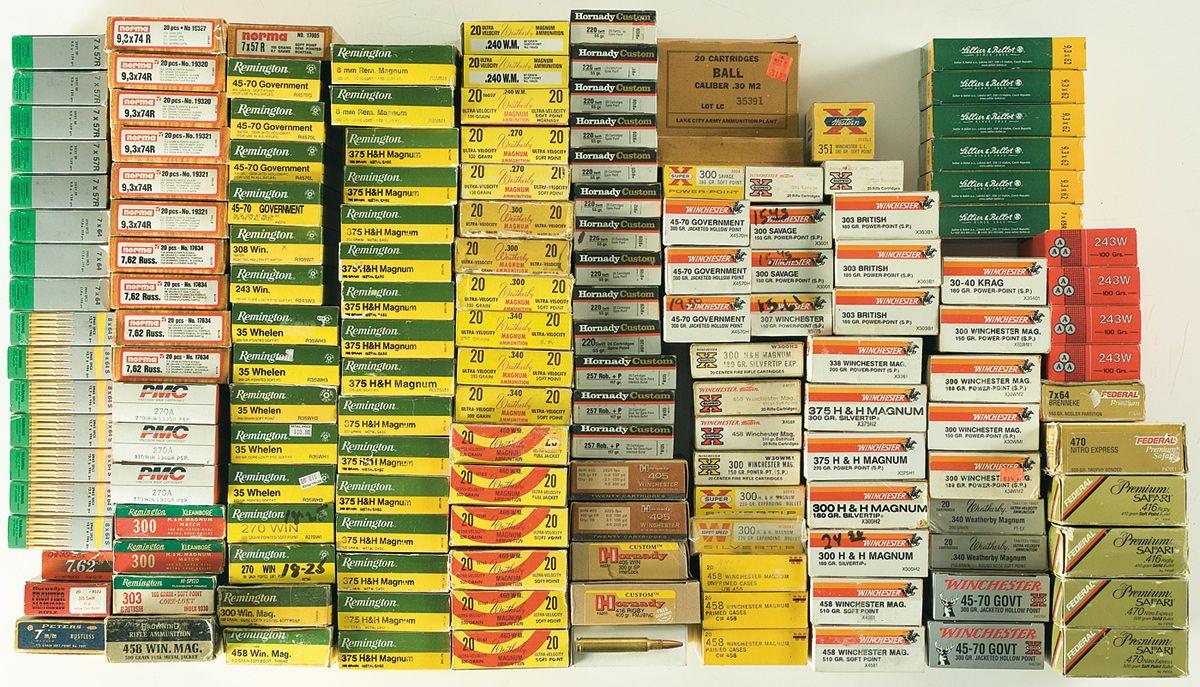 Assorted manufacturers and calibers, with emphasis on military and large hunting cartridges. Calibers include, 30-06, 458 Magnum, 300 H&H, 375 H&H, 35 Whelen, 30 Carbine, 303 British, 30 Krag and others.