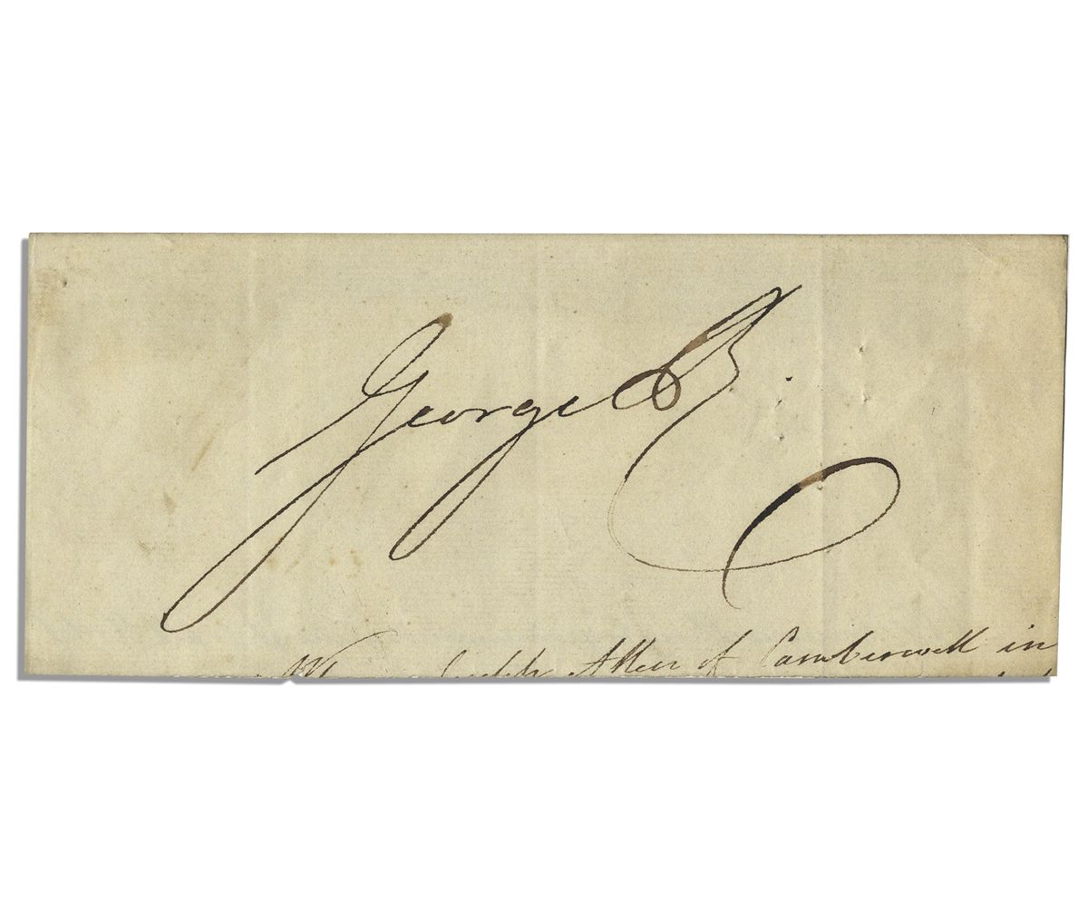 George IV signature as King. Slip, clipped from a larger document is signed, ''George R'' in ink. A single line of text remains to verso and reads, ''We being willing to give encouragement to all Arts''. Measures 7.25'' x 3.25''. Paper remnants to verso from mounting and pinholes after the ''R'', else near fine.