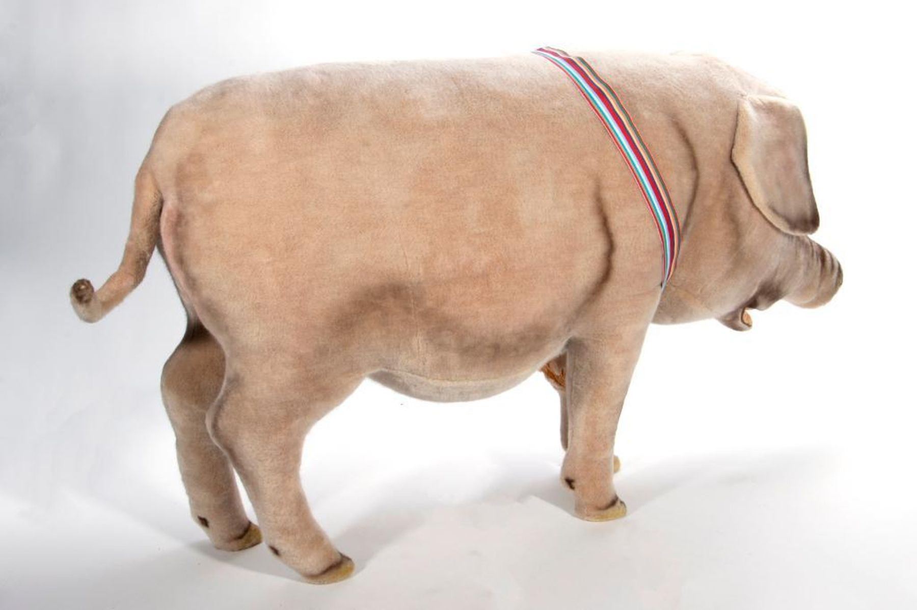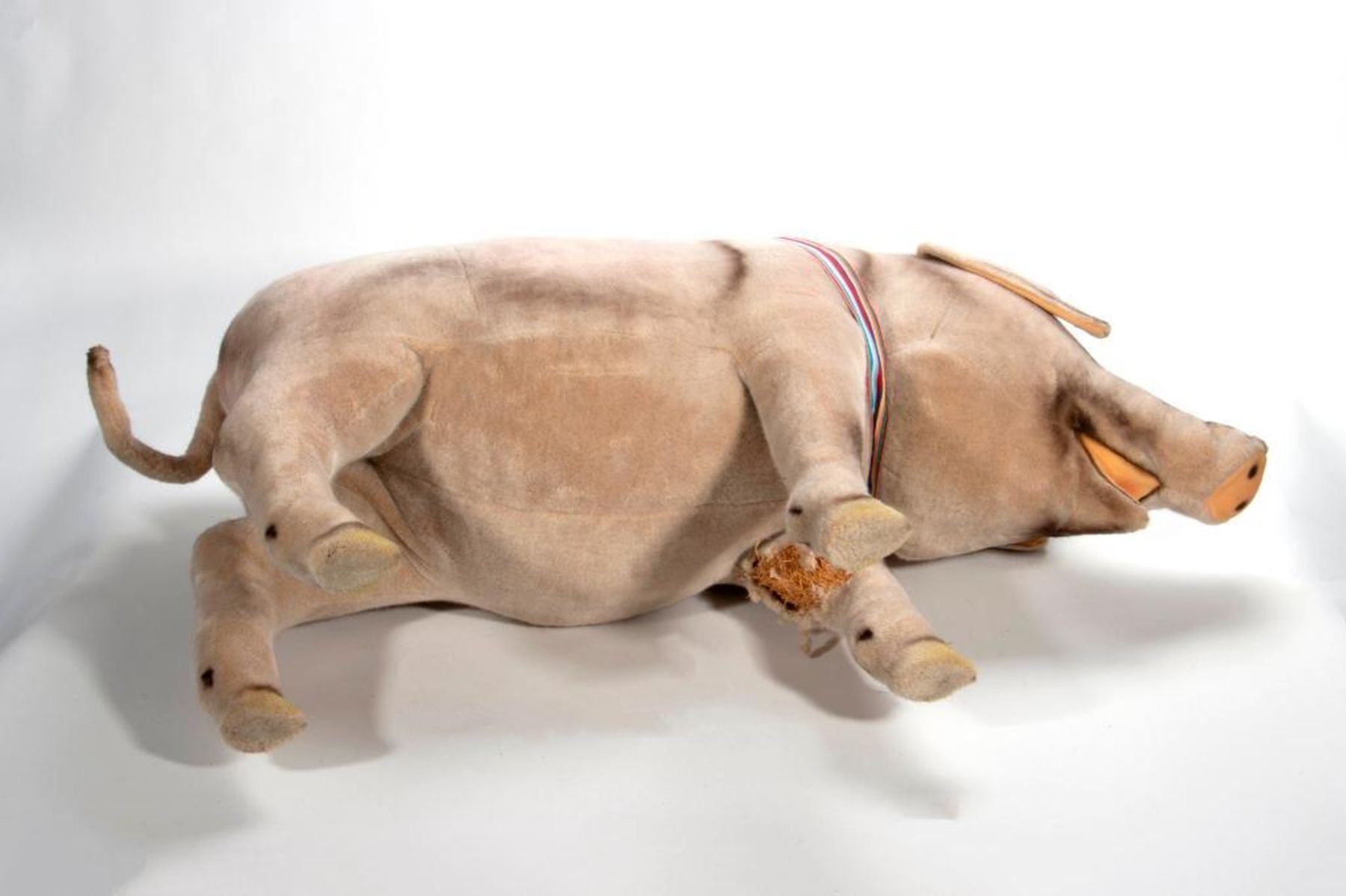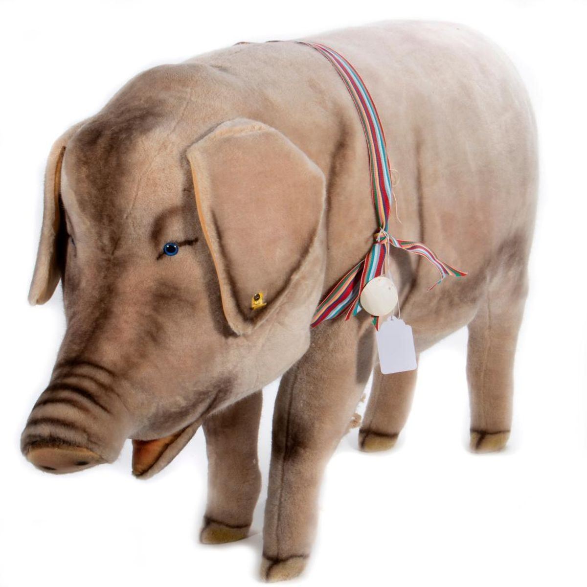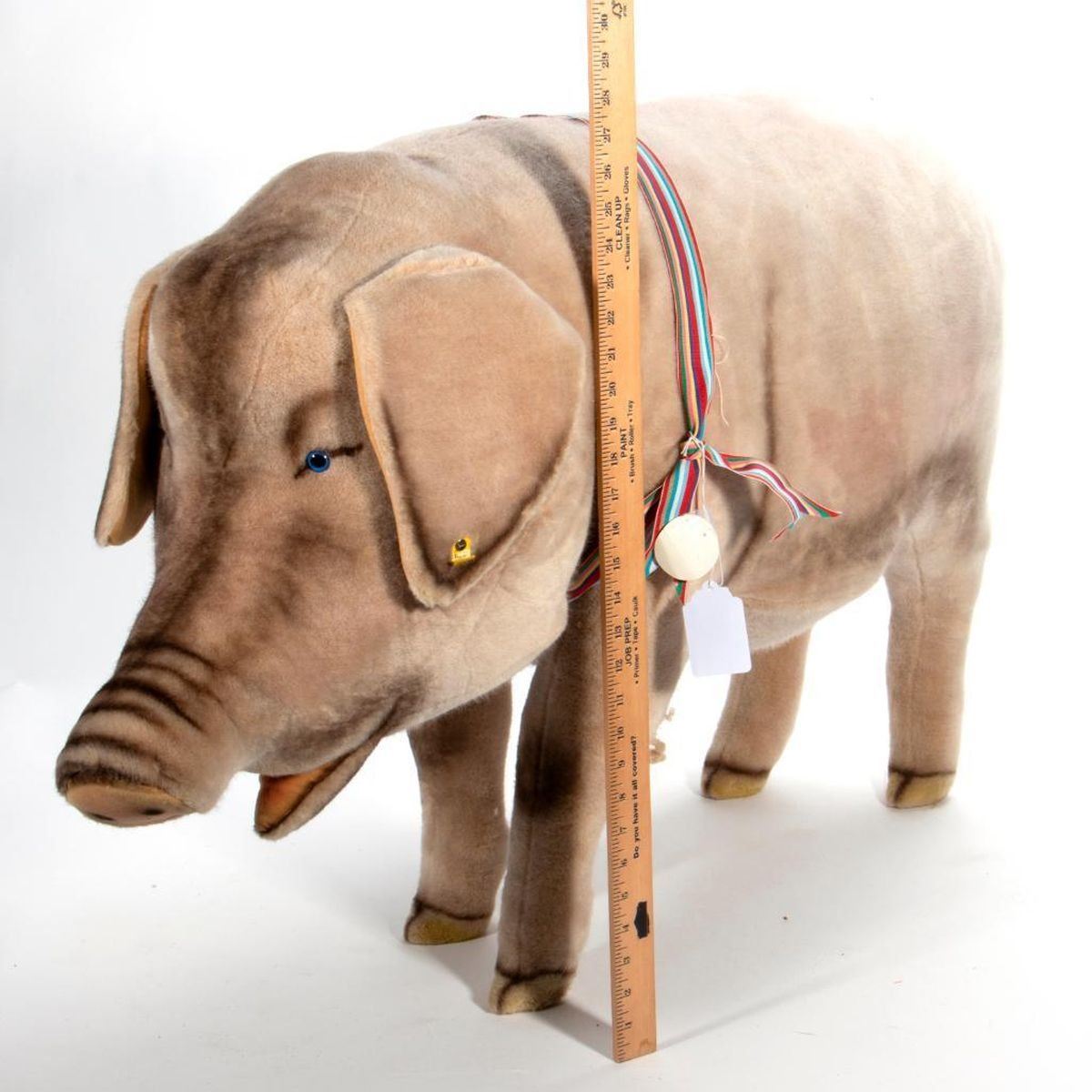 Large scale vintage 1980 Steiff Pig having original tag and button. Original FAO Schwarz store display. There is some fabric loss and exposed straw on the back of the right front leg. Measurement at largest 44 inches.