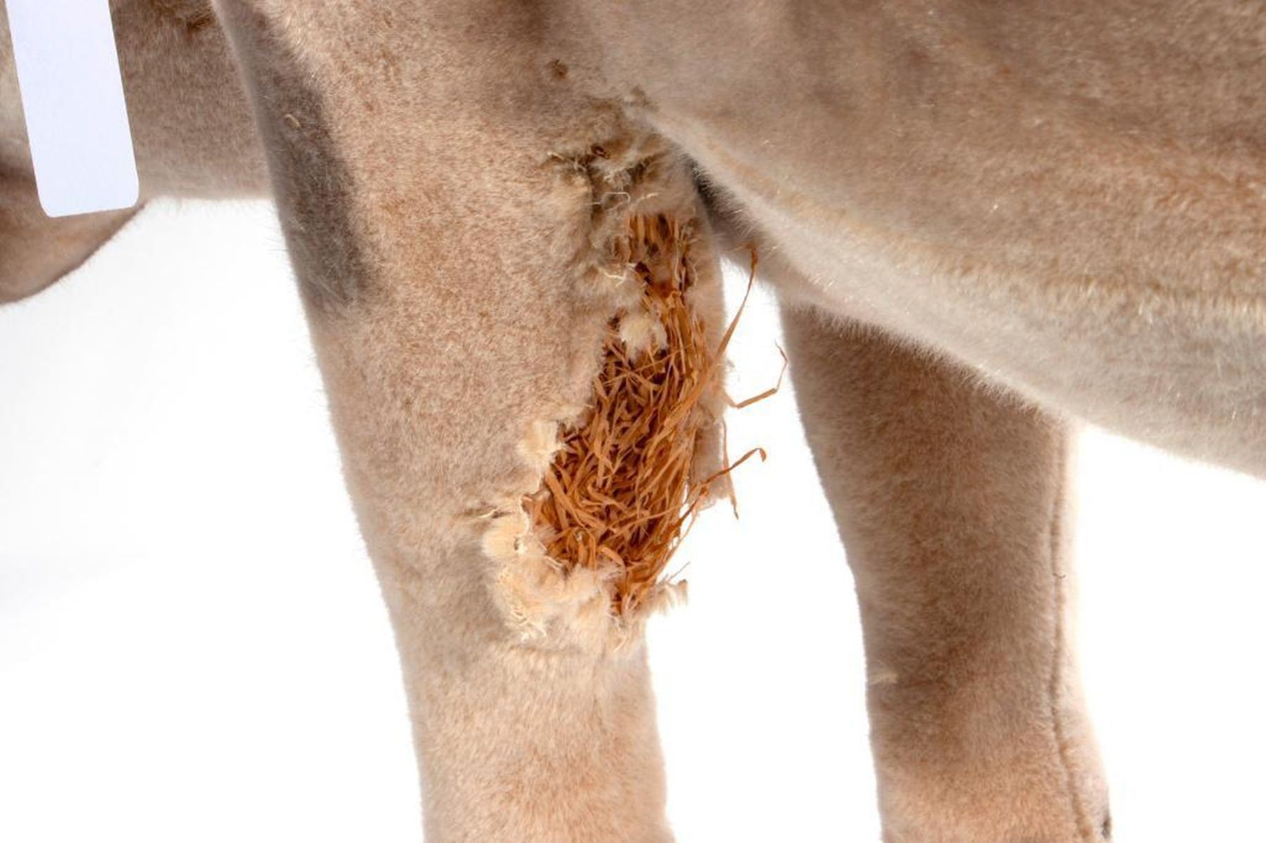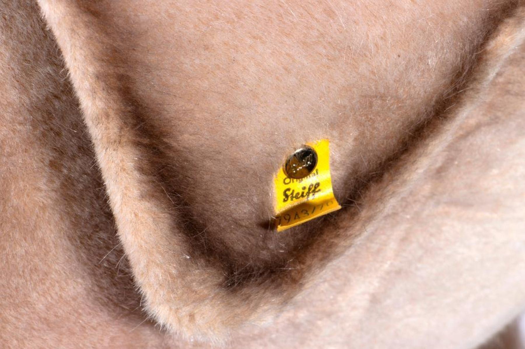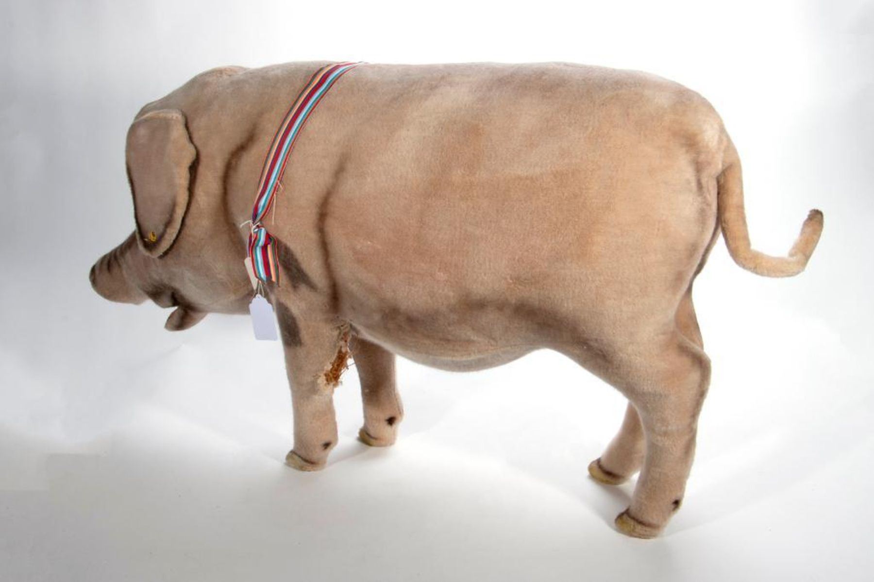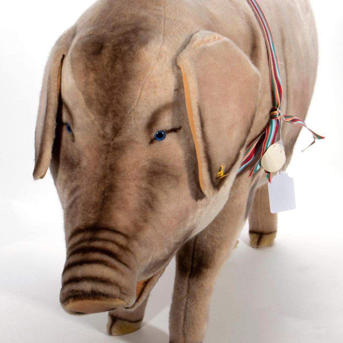 Large scale vintage 1980 Steiff Pig having original tag and button. Original FAO Schwarz store display. There is some fabric loss and exposed straw on the back of the right front leg. Measurement at largest 44 inches.