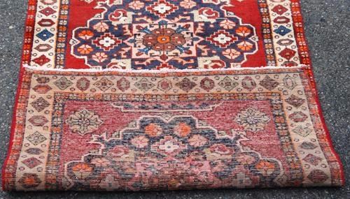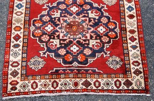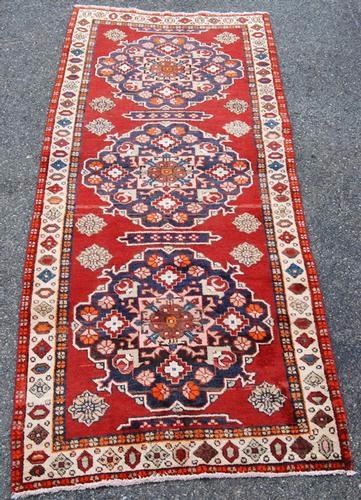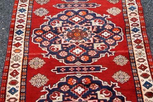 Very lovely hand woven Persian Karajeh runner. Made of fine quality lamb's wool pile on cotton foundation. All natural vegetable dye, this beautiful rug incorporates a lovely set of floral motifs on a rich red background, with a set of three large medallions and contrasted wonderfully by an intricately done floral border. Hand woven in City of Karajeh from Iran. size: 12 feet 9 inches X 3 feet 10 inches.