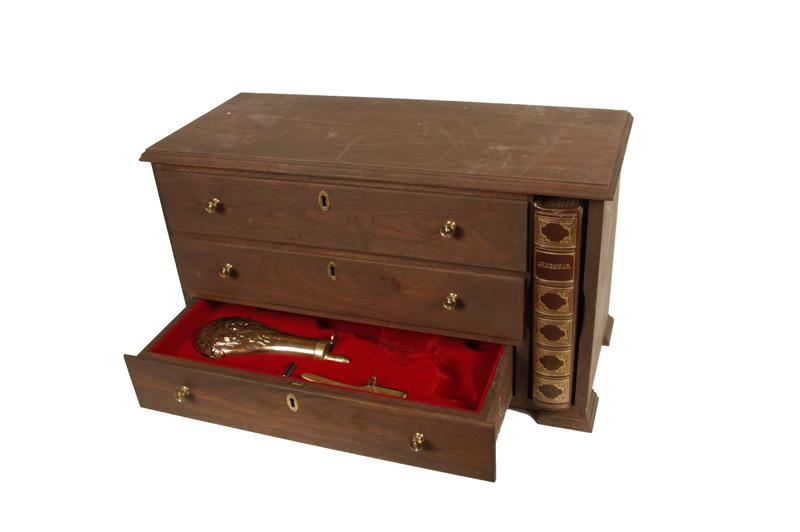 Very Nice Dresser Top Gun Display Box Built to hold the Samuel Colt "Armsmear" Commemorative Collection of three black powder Colt revolvers. Includes 3 lined and lockable drawers for the 3 revolvers in the collection and a bound volume on the history oBuilt to hold the Samuel Colt "Armsmear" Commemorative Collection of three black powder Colt revolvers. Includes 3 lined and lockable drawers for the 3 revolvers in the collection and a bound volume on the history of the home and theman. A great place to store guns, even if you don't have the 3 for the collection.