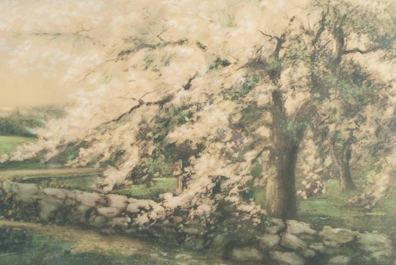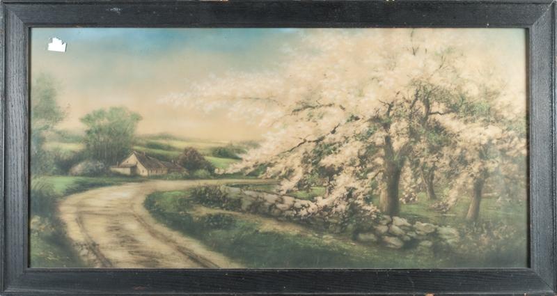 Finely painted to depict a chalet on a winding road with a stone lined wall and trees in full bloom, unsigned, 18"H X 36.5"W sight, circa 1900 nicely framed in black frame.
