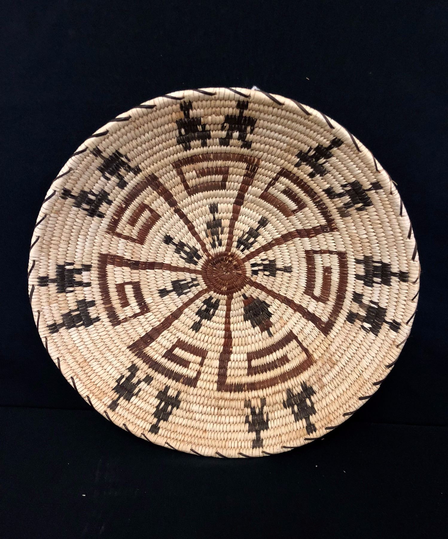 Maker: Unknown T.O weaver. Approx. Age: Circa 1980s. Size: 11 1/2” wide x 2 1/2” tall. Additional Info: Very Nice Tohono O’odham Basket with figures and designs. Condition: Good for it’s age. Please look closely at the pictures - they are an important part of our description. Shipping: There will be a $7 handling / packaging fee for shipping this lot. The actual cost of postage will be added on top of that.