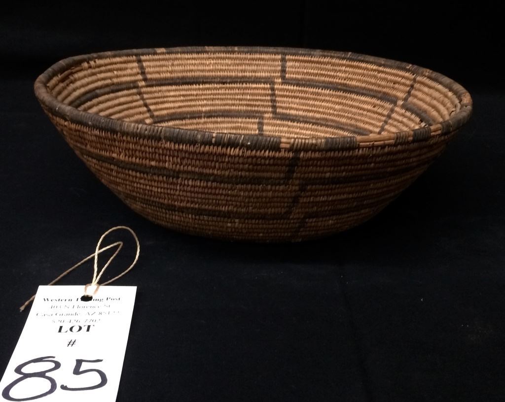 This old Apache (Circa 1900) basket measures 11.25” across and 4” deep. Please note there is some stitch loss, please look closely at pics to see condition. Shipping: There will be a $7 handling / packaging fee for shipping this lot. The actual cost of postage will be added on top of that.