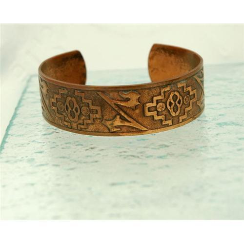 Old solid copper cuff bracelet with a classic Southwestern motif.   It is 7/8" wide and the length is 6 1/2".   On the inside it says "Genuine Copper" <p>The condition is very good other than old patina and oxidation.