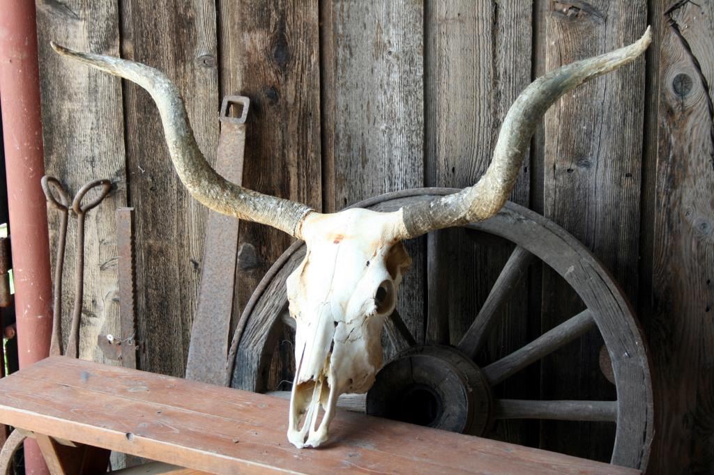 Very old Texas longhorn skull with about a 45" spread between the horn tips. The horns have a "mossy" finish from the years they hung in the ranch tackroom.