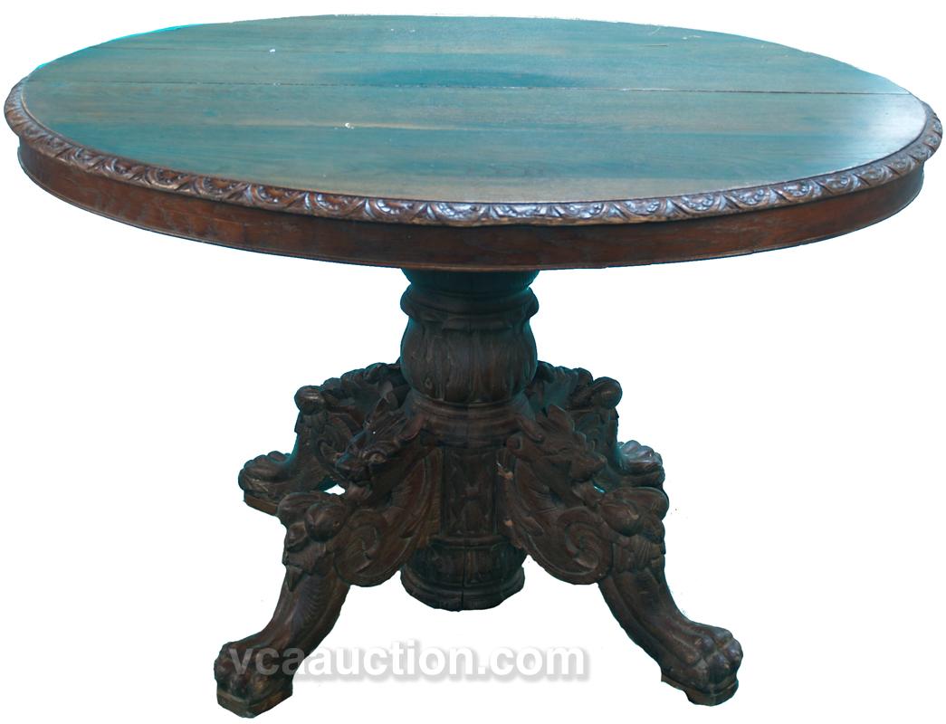 Very Ornate Oval Oak Carved Skirt Table w/ 4 claw feet dragon heads for the base, very nice - 51" x 44"