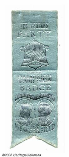 <B>Very Rare 1892 Weaver - Field Populist Jugate Ribbon</B></I> "For Free and Unlimited Coinage," with silvering on powder blue background. Weaver campaign items are quite rare, and among the most prized by Third Party collectors. A jugate like this is especially sweet! Surely not more than several are known to exist. Choice condition, with original pin on reverse. It is very hard to find ribbons with this sort of construction without significant wear or flaking of the gold or silver design elements. Length 5.75". Lot:260