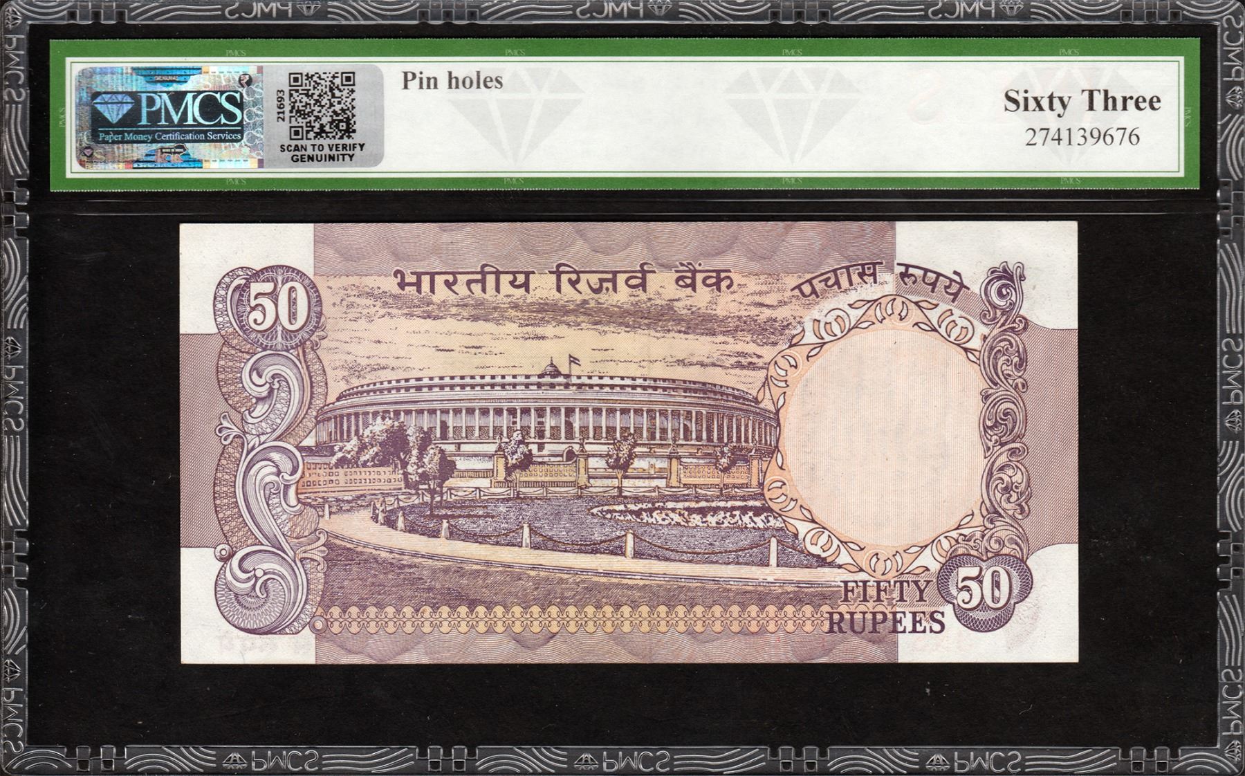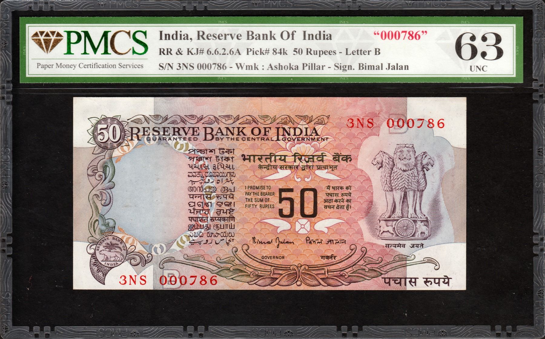 Republic India, 1997-98, 50 Rupees, 000786, Fancy Number, Signed by Bimal Jalan, B Inset, NS Prefix, S. No. 3NS 000786, pinholes, graded by PMCS as 63 UNC, Very Rare.