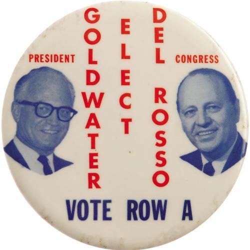 <B>Very Rare 3" Barry Goldwater Pinback</B></I> Large 1964 Republican jugate button featuring Goldwater for President and Del Rosso for Congress. Below the portraits is a plea to "Vote Row A". Extra fine condition with minor scratches only visible in angled lighting. This variety has been found most often with spots whereas this example has none.
