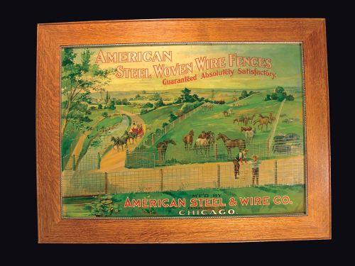 Very Rare American Fence Tin Sign. American Steel and Wire Co., Chicago, Ill. Chas. Shonk, Lithographer. Excellent Subject Matter and Great Colors. Excellent Condition. 27 1/2 x 19 1/2 inches.