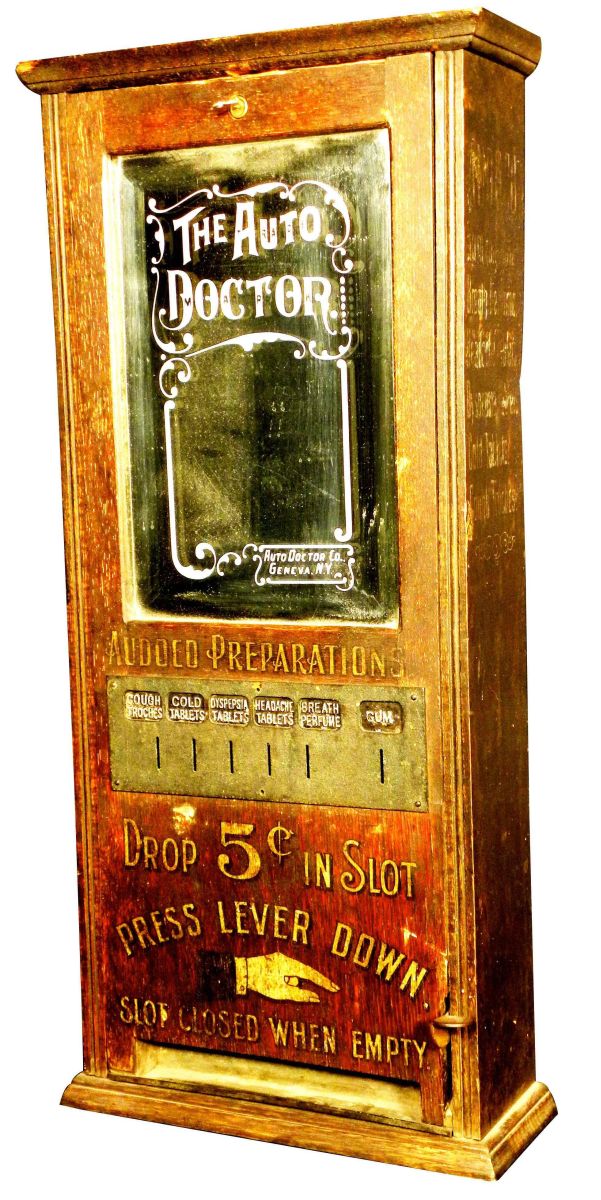 Very Rare Coin Operated Five Cent Vendor, the Auto Doctor Co. Geneva, NY. Auduco preparations, all wood. Good original working condition. 12 1/2 X 27 X 4 3/4 inches.