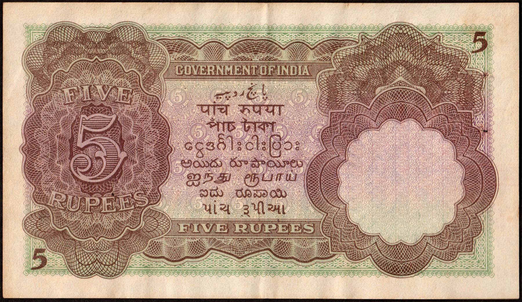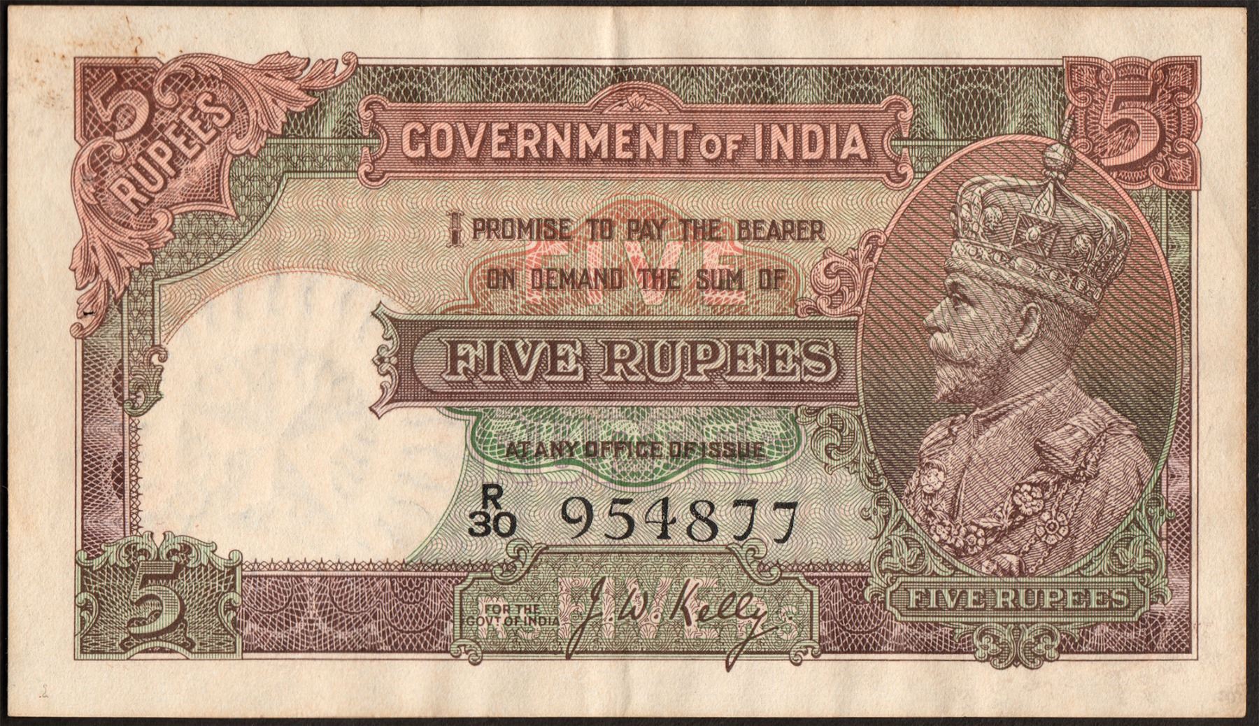 British India,1934, King George V, 5 Rupees, Signed by J.W. Kelly, R Prefix, S. No. R30 954877, printed in Nasik, (KJ & RR # 3.5.2), staple holes at issue, fold, minor stains, crisp paper quality, about extremely fine, Very Rare.