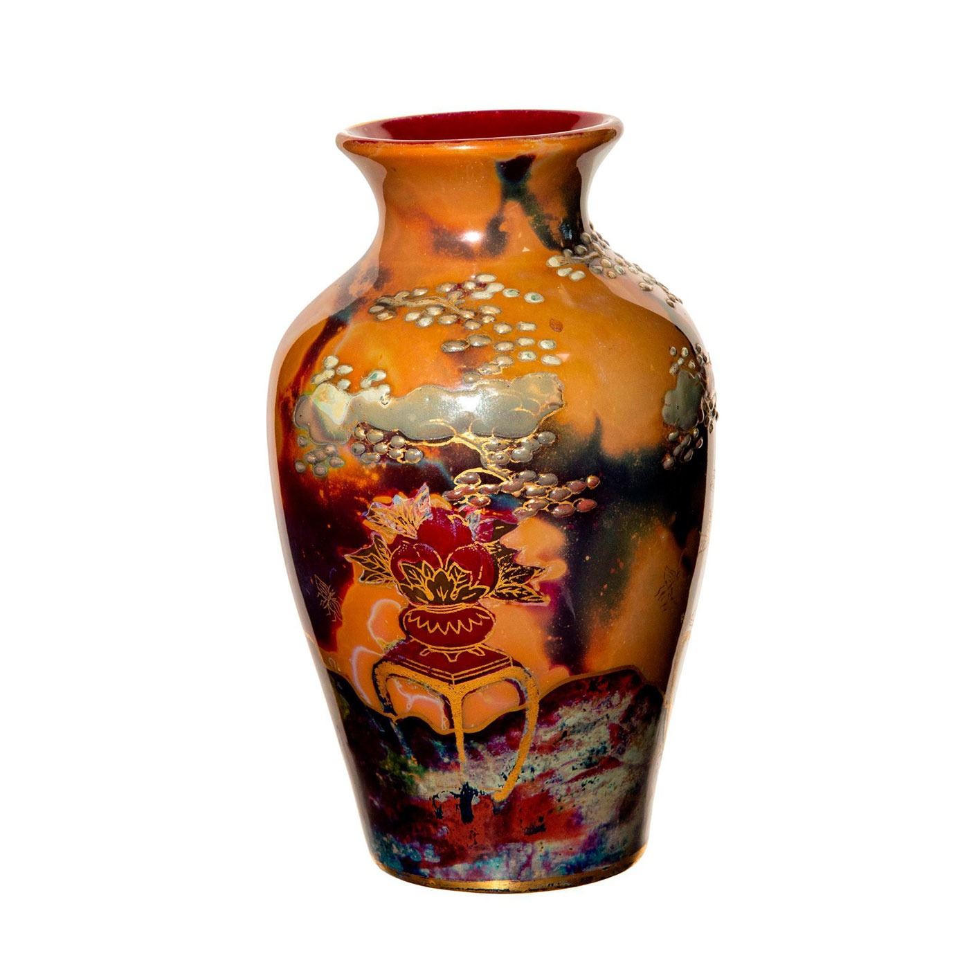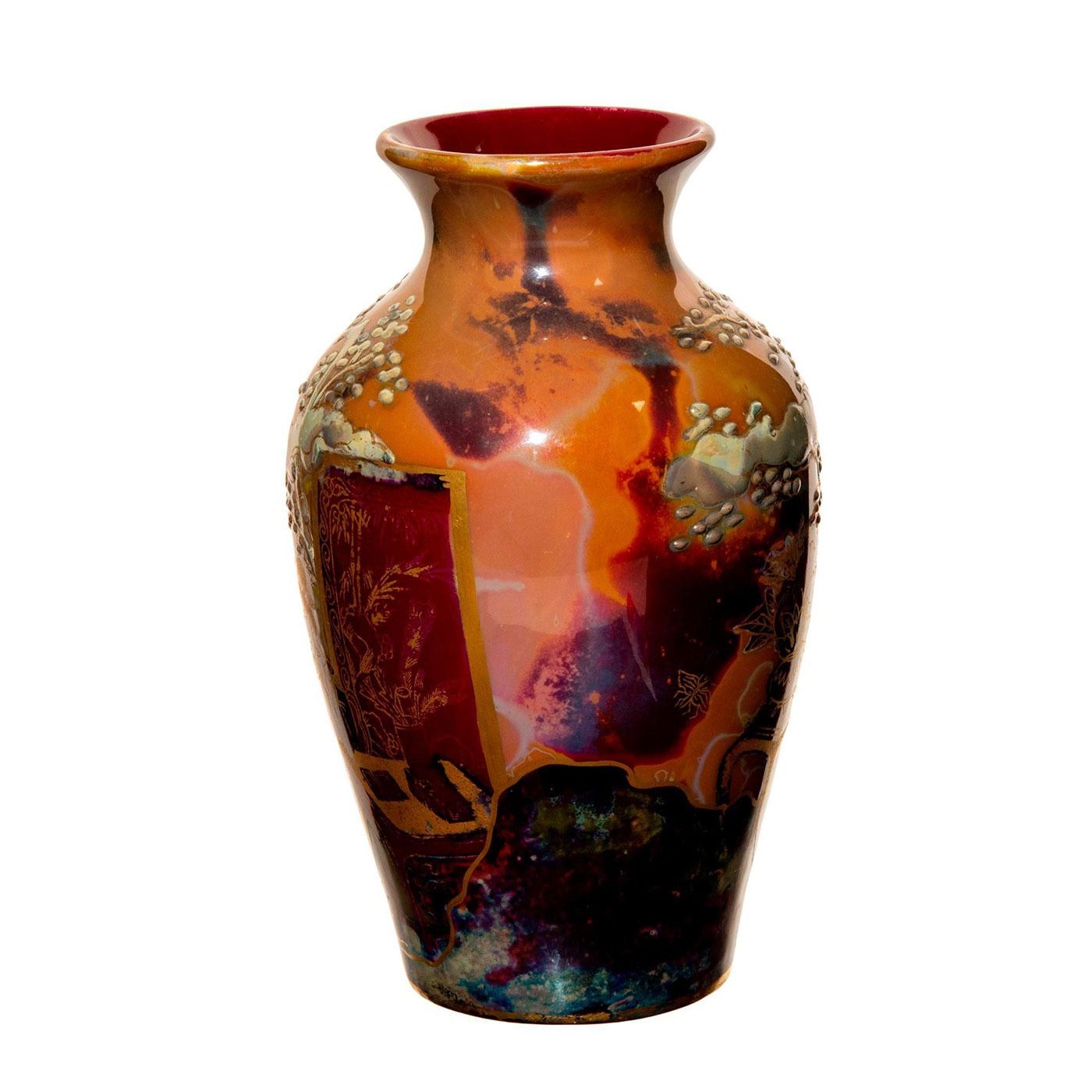 Exquisitely designed flambe vase depicting a seated geisha in Asian style setting; gilt highlights. Baluster form with flared rim. Bernard Moore backstamp. Fade to gilt.