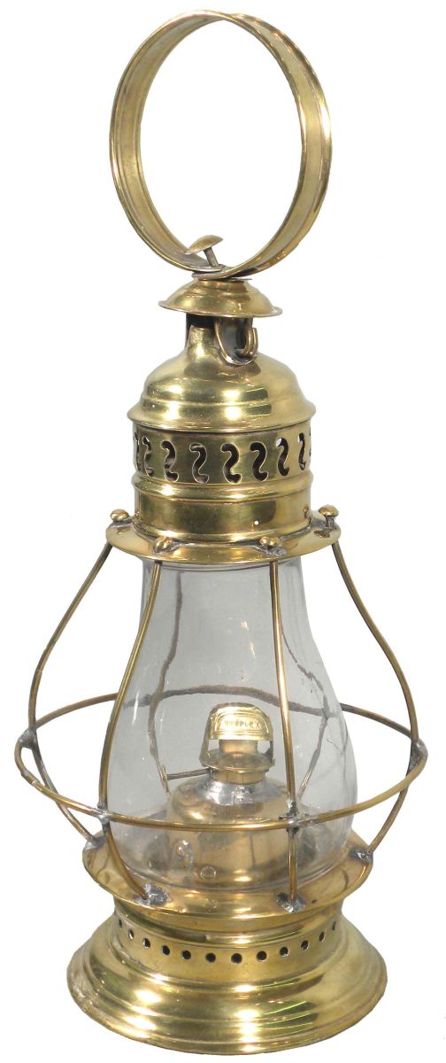 Very Rare Brass Wristlet Fire Lantern. The Brooklyn Flint Glass Co. South Williamantic, CT. patent date 1881. Complete with burner. Very good original condition. 12 1/2 inches tall w/o bale.
