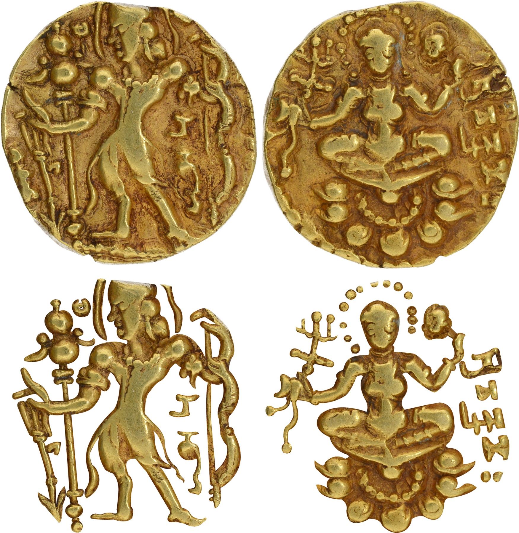 Note: This is an interesting specimen where the noose held by the Queen appears as Lord Ganesha in its stylized depiction. This gorgeous coin is fully struck with complete figures of the bow, arrow, standard, lotus, King, and Queen clearly visible on both sides.