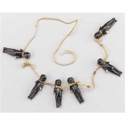 <B>Very Rare Child's Bracelet Depicting Slaves Tied Together.</B></I> This is made of braided string that ties six 1¼” long black figures of slaves together at the neck. This piece is from the period of before the Civil War and would have been worn and played with by a child. Indeed it has seen much wear as the arms of each of the figures have broken off. Examples of such bracelets have only been seen in museums.<BR><BR><b>Shipping:</b> Miscellaneous Collectibles, Smal (<a target="_blank" href="http://www.heritageauctions.com/common/shipping.php">view shipping information</a>)