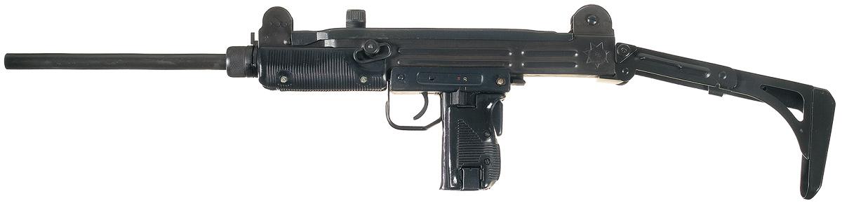 This is a very unusual/rare copy of the Israeli Uzi made by Norinco and as imported by ACC/Intrac company. Standard post front sight with side protectors, adjustable rear peep sight, fires from a closed bolt, importer marked receiver, serrated composite forearm and pistol grip, and folding metal stock.
