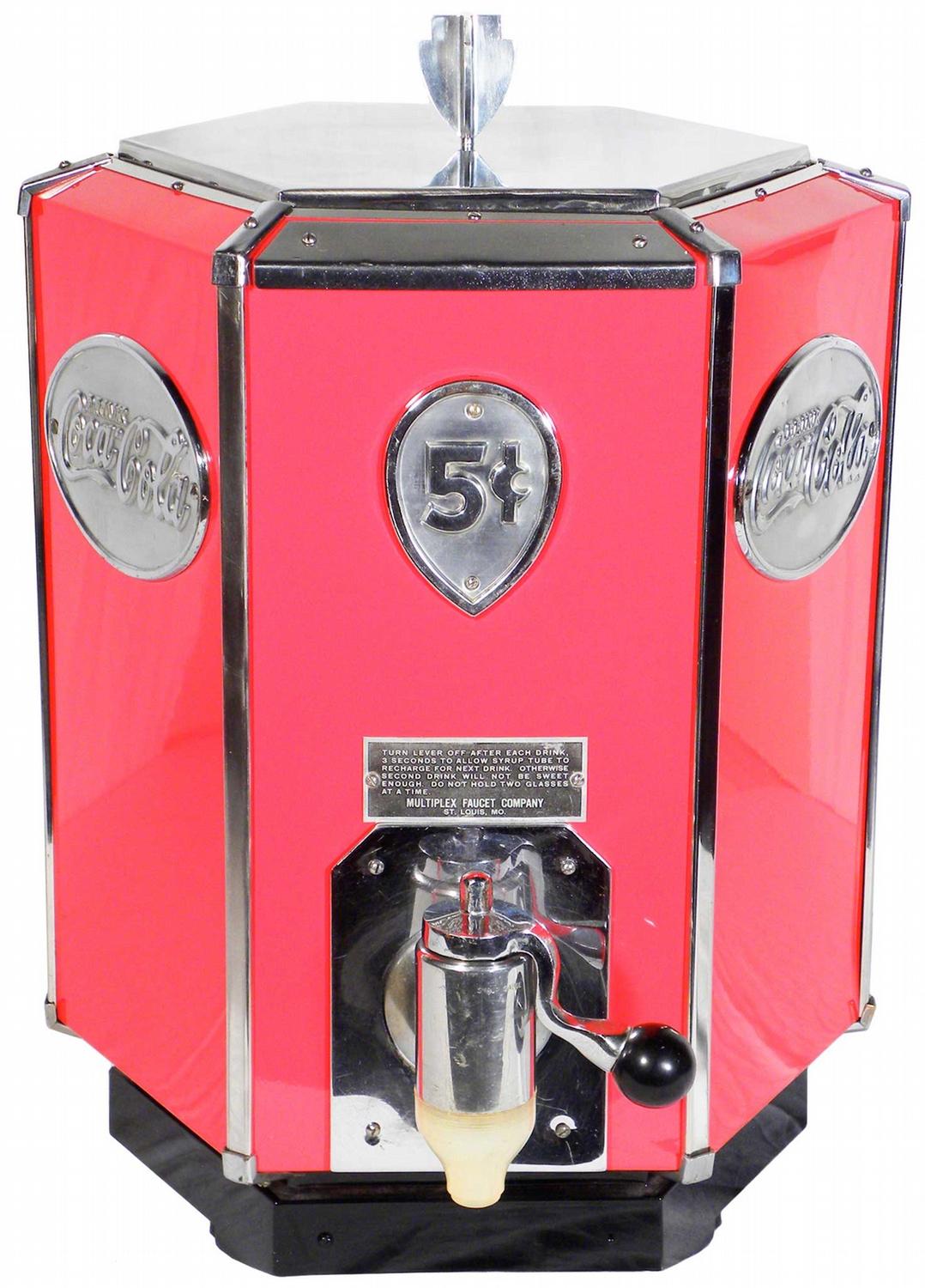 Very Rare Coca Cola Hexagon Soda Dispenser, 5 cents. Made by the Multiplex Faucet Co. St. Louis, MO. The only one we have ever seen. Complete and all original. 16 1/2 X 21 1/2 X 17 1/2 inches.