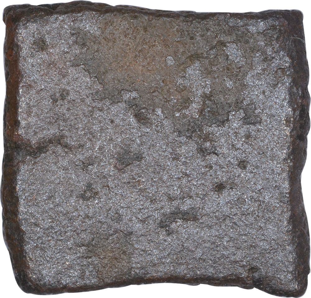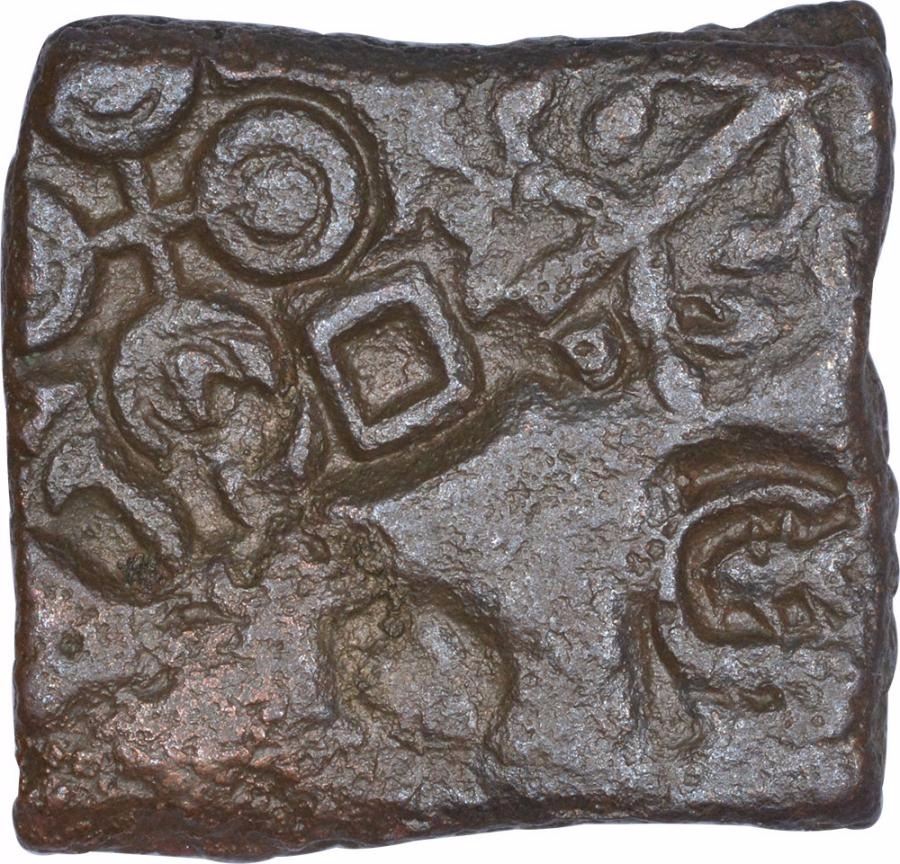Bhadra Mitra Dynasty, Kingdom of Vidarbha, Asvabandhu (100 BC), Copper Unit, Obv: ujjaini symbol top left, tree top right, river with two fishes bottom right, bull bottom left, brahmi “aasabu(dha)”, Rev: uniface, 2.92g, 13.50x12.85mm, about extremely fine, Very Rare.