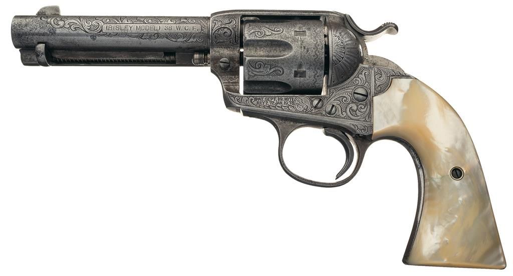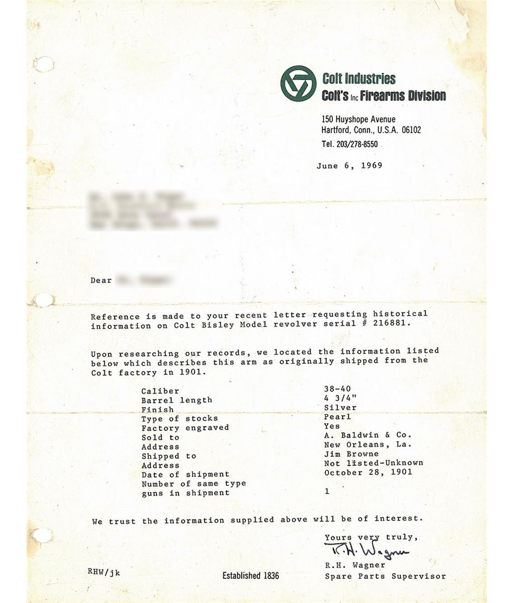 Very Rare Colt Bisley Model revolver with factory engraving, silver-plated finish and pearl grips. On page 266-7 of "THE BOOK OF COLT FIREARMS" author R.L Wilson notes: "Engraved Bisley revolvers are very rare, and Colt factory records indicate that less than 60 were made". Wilson further notes that Bisley revolvers with silver-plated finishes are extremely rare and that silver plating was almost exclusively restricted to engraved guns. Pearl grips are also rare on Bisley Model revolvers. This revolver is complete with two Colt factory letters dated 1969 and 1984. The letters list the revolver features as: "Barrel Length: 4 3/4:, Finish: Silver, Type of Stocks: Pearl" and "Factory Engraved: Yes". The letters state that this revolver was shipped to A. Baldwin and Co., New Orleans, Louisiana, for Jim Brown on October 28, 1901. The revolver is decorated with Colt "B" scroll and punch-dot engraving that is nearly identical to the work on Bisley model serial number 266985 illustrated on page 450 of "THE COLT ENGRAVING BOOK VOLUME ONE" by R.L. Wilson. The engraving was almost certainly executed by Colt chief engraver Cuno A. Helfricht. The top of the barrel is roll-stamped with the two-line legend: "COLT'S PT. F.A. MFG. CO./HARTFORD, CT.U.S.A." in a engraved panel with double-line borders. "(BISLEY MODEL) 38 W.C.F." is roll-stamped in an oval panel on the left side of the barrel. The Colt 'Three-Date/Two-Line' patent markings and rampant Colt trademark enclosed in a double circle are roll-stamped on the left side of the frame in a scroll-work panel. The assembly number "98" is stamped on the inside of the loading gate. The serial number, "216881" is stamped on the bottom of the frame, trigger guard and back strap. All of the visible serial numbers match.